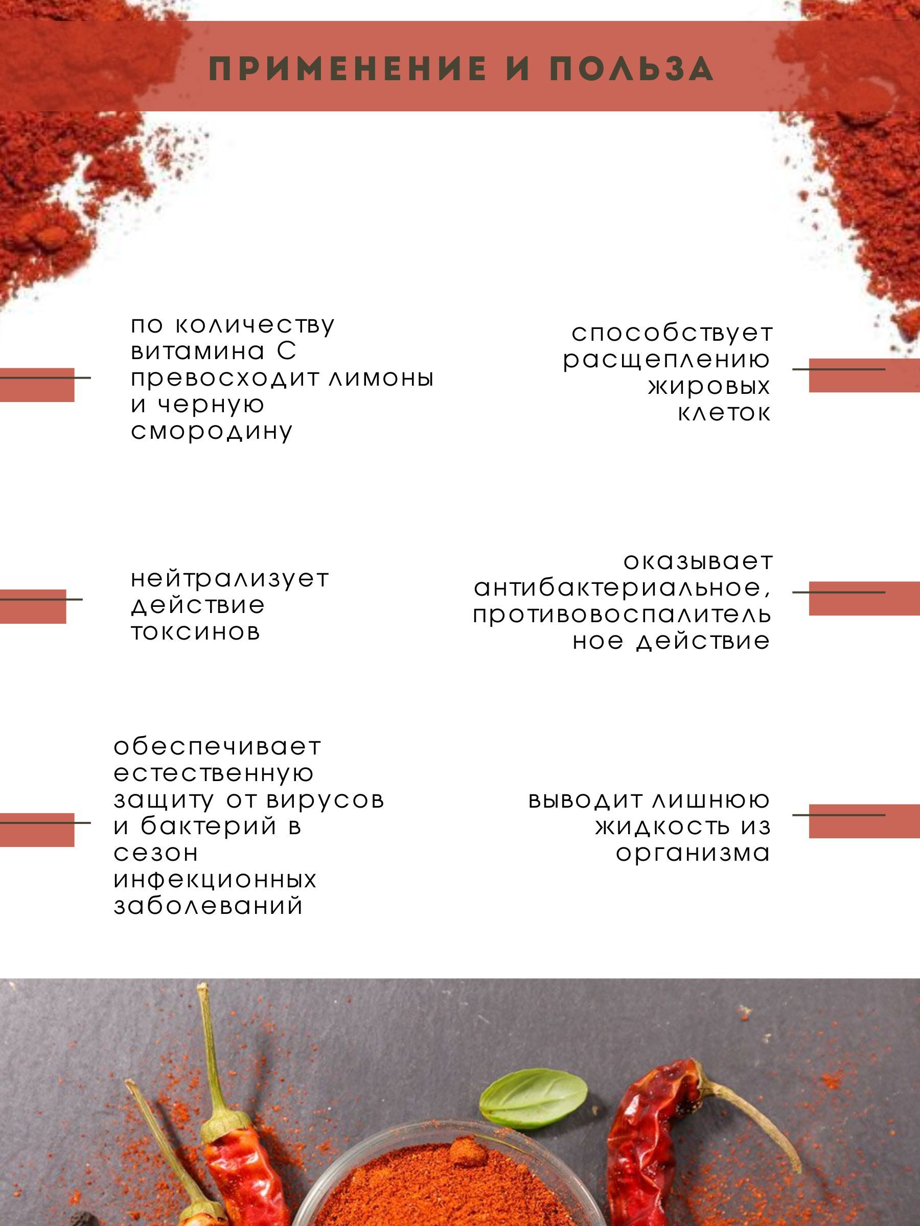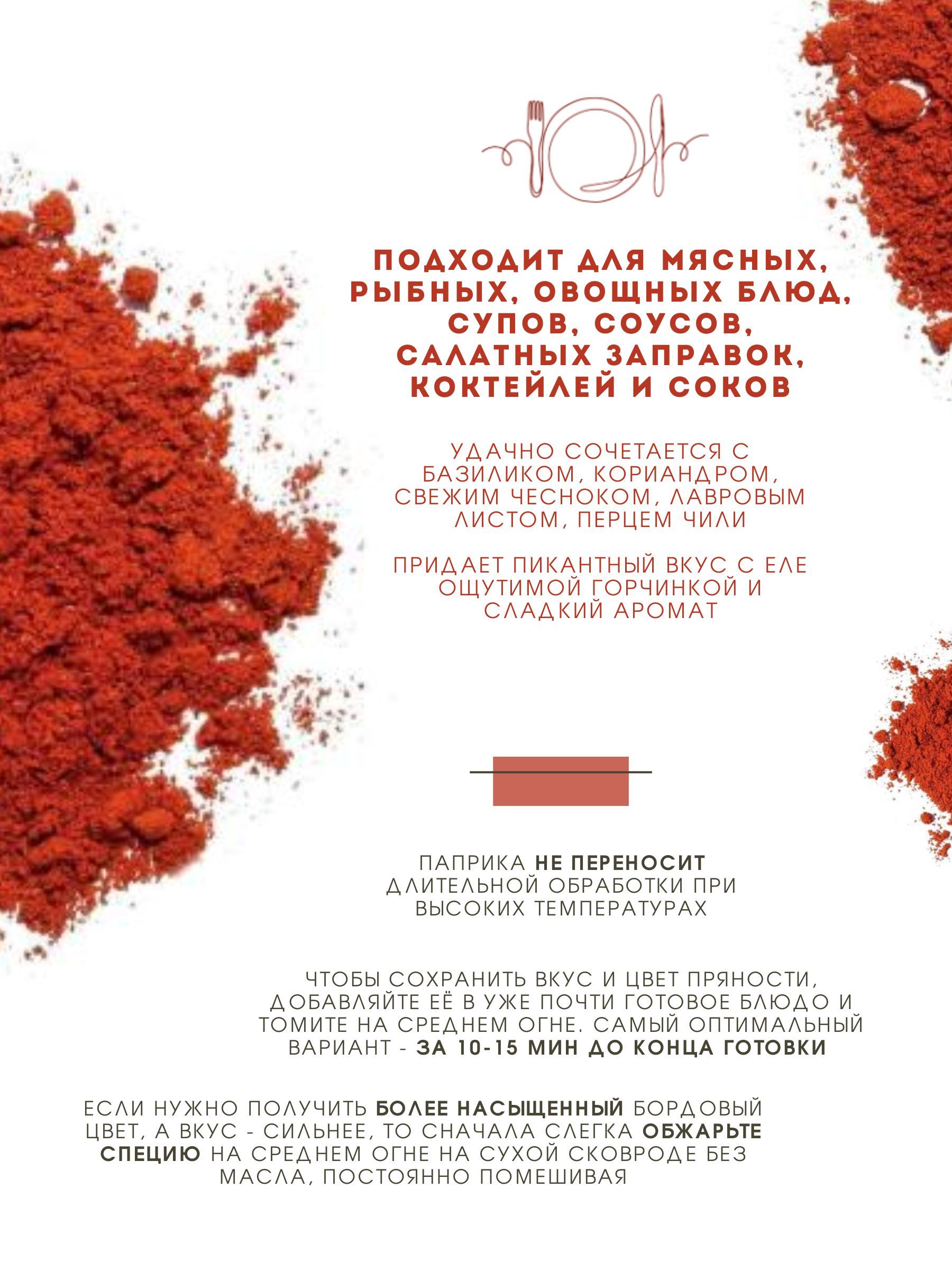 Описание: Паприка сладкая - приправа, смолотая из сушеного сладкого или слабожгучего перца красных сортов. Для изготовления порошка плоды красного перца сначала сушат, а потом размалывают. Паприка приправа используется в мексиканской, испанской, венгерской, немецкой кухне. Ее добавляют практически во все мясные блюда, особенно хорошо она сочетается с курицей и свининой. Приправа паприка прекрасно сочетается с овощами, особенно томатами и капустой. Очень часто ее добавляют в супы, на основе специи паприка готовят разнообразные соусы. С добавлением паприки сладкой молотой приправы готовят знаменитое блюдо венгерской кухни - цыпленка с паприкой. Паприка молотая сладкая входит в состав известной приправы барбекю. Обычное картофельное пюре, если его заправить паприкой в сочетании с чесноком, кориандром, базиликом, чабером и порошком лаврового листа, превратится в аппетитный и вкусный гарнир. Помимо вкуса и запаха паприка красная молотая меняет цвет блюда, окрашивает пищу в красный или оранжевый цвет, но это происходит только при нагревании. В паприке содержится витамина С в несколько раз больше, чем в цитрусовых, поэтому эта приправа не только дополнит вкус ваших блюд, но и принесёт пользу организму.