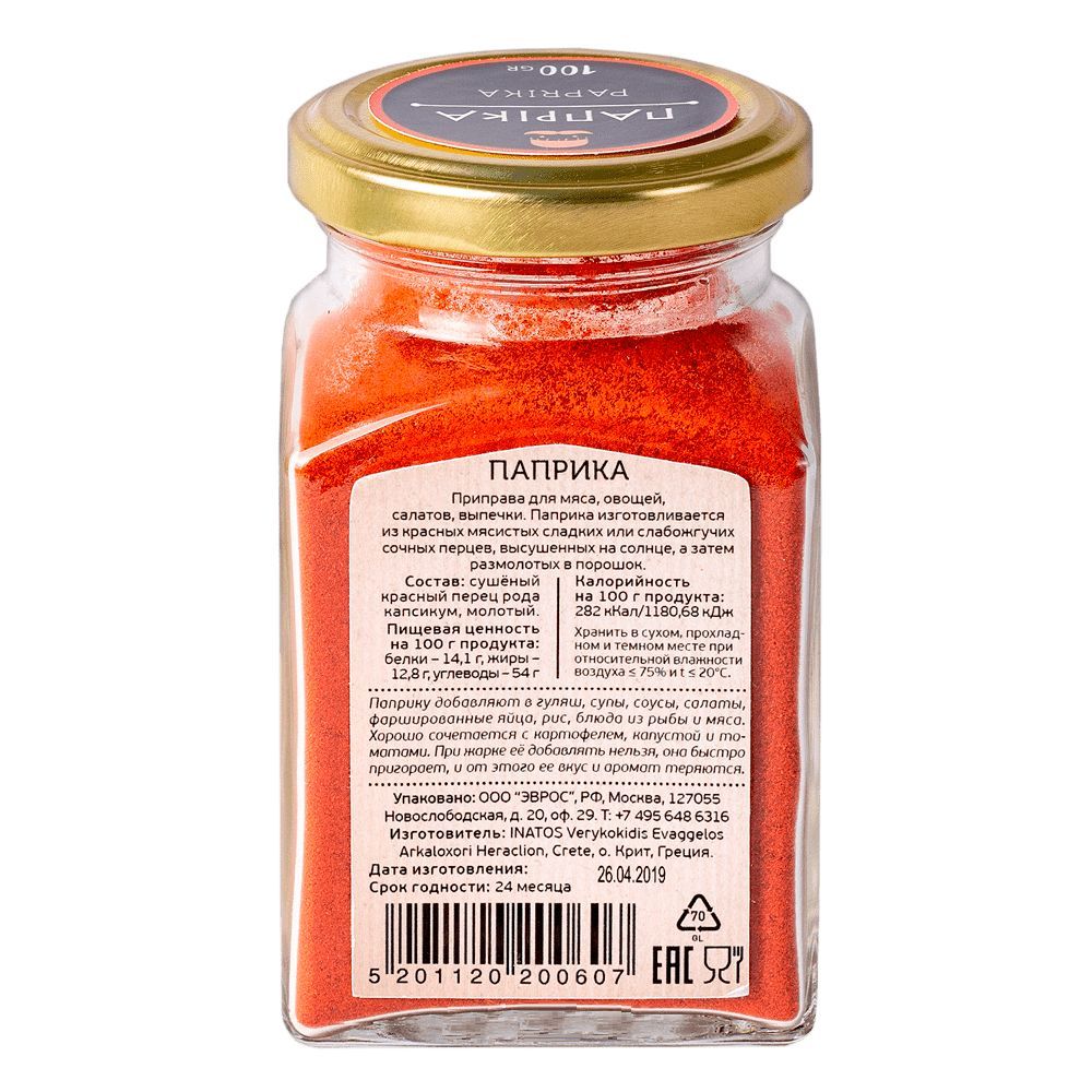 Описание: Паприка сушеная (порошок). Паприка изготавливается из красных сладких или слабожгучих сочных перцев, высушенных на солнце, а затем размолотых в порошок. Приправа для мяса, овощей, салатов, выпечки. Прекрасно сочетается с мясом, овощами, особенно с томатами и капустой, сыром, творогом, яйцами, рыбой и морепродуктами. Кладут паприку в гуляш, чили, супы, соусы, салаты, фаршированные яйца, рис. Хорошо добавлять молотый сладкий перец в картофельное пюре в сочетании с чесноком, кориандром, базиликом, чабером, порошком лаврового листа. При жарке сладкую паприку добавлять нежелательно, так как она пригорает, вкус и аромат теряются. Хранить в плотно закрытой банке при температуре не выше 25 градусов Цельсия и относительной влажности воздуха не более 75%, предотвращая попадание прямых солнечных лучей. СТО 44251051-004-2021. Страна происхождения сырья: Греция, о.Крит. INATOS Verykokidis Evaggelos.