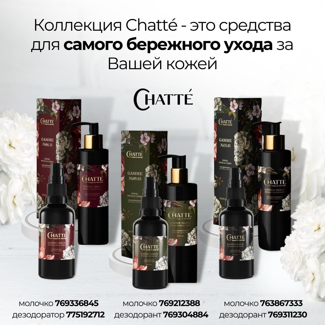 Коллекция Chatté - это средства для самого бережного ухода за Вашей кожей. Чарующие ароматы и энергия природных ингредиентов созданы с заботой о Вашей красоте и здоровье.