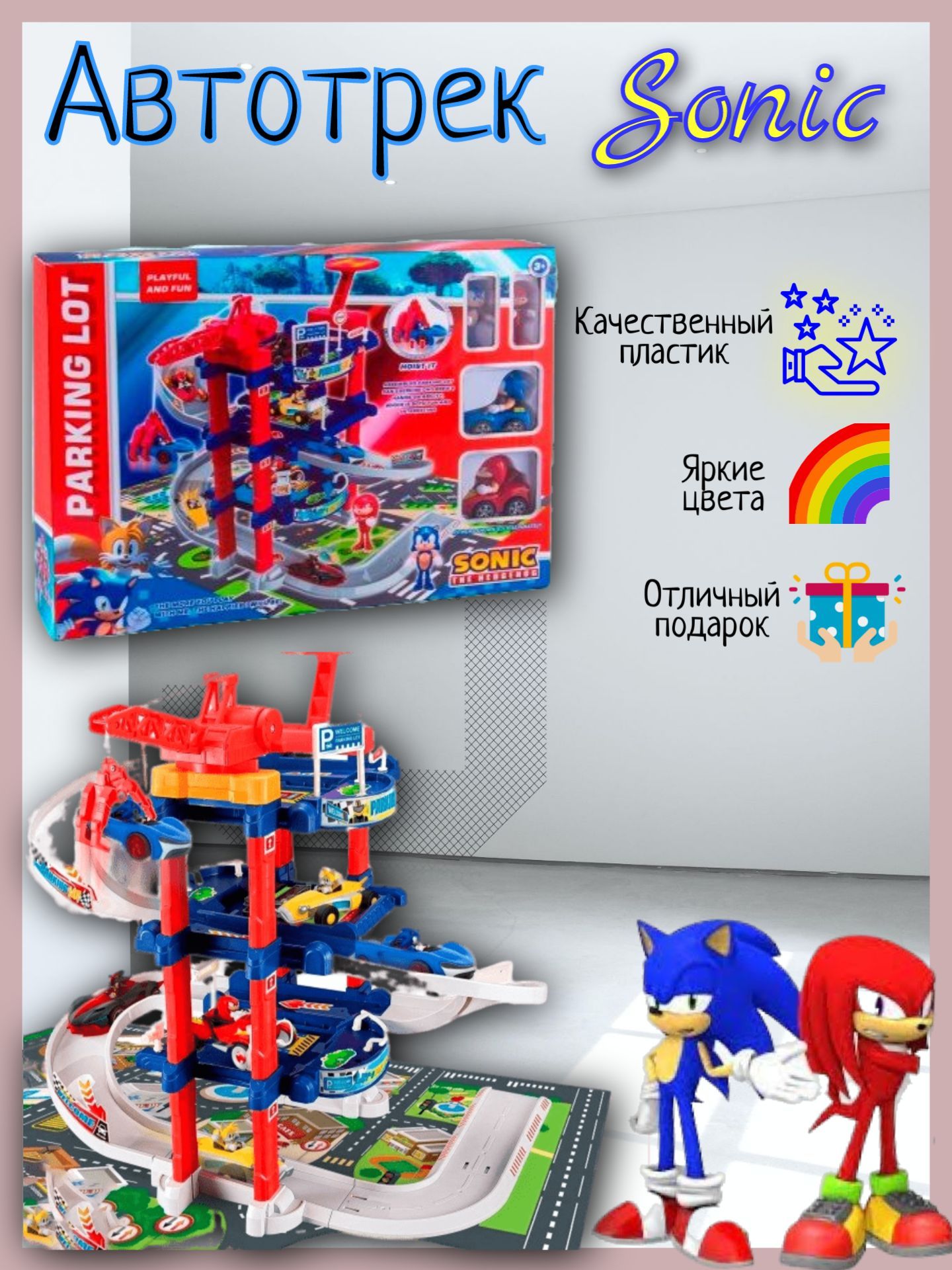 Описание: Многоуровневая парковка Соник для детейПаркинг многоуровневый - это большой и увлекательный комплекс для автомобилей. В него входят игрушки из всеми любимого мультфильма Sonic. Большим сюрпризом для ребенка будет наличие машинки в коробке. Паркинг хорошо развивает у ребенка мелкую моторику рук, память, воображение, пространственное мышление, творчество. Все элементы выглядит ярко и красочно, выполненные из качественного и безопасного пластика. Будет идеальным подарком для ребенка.