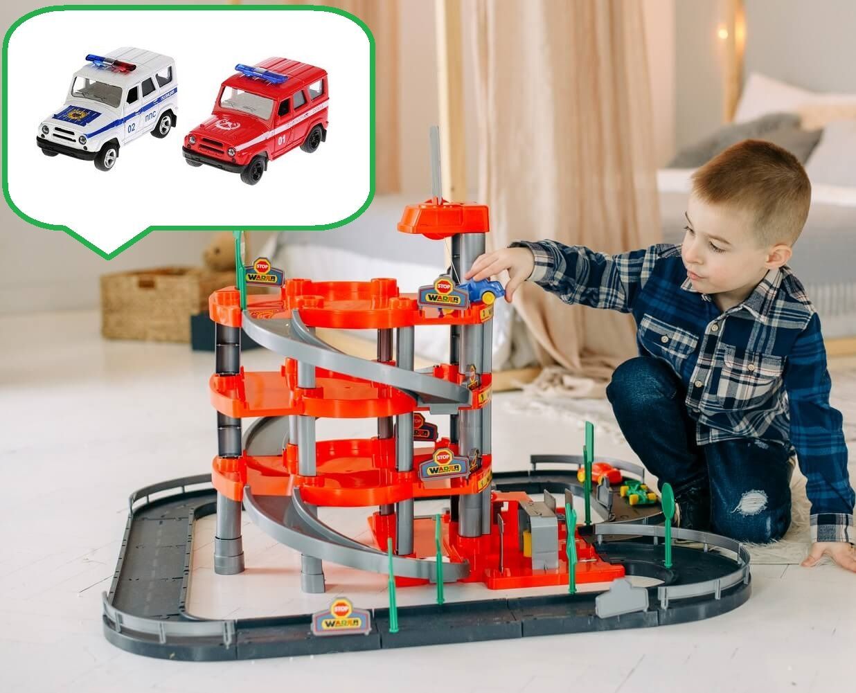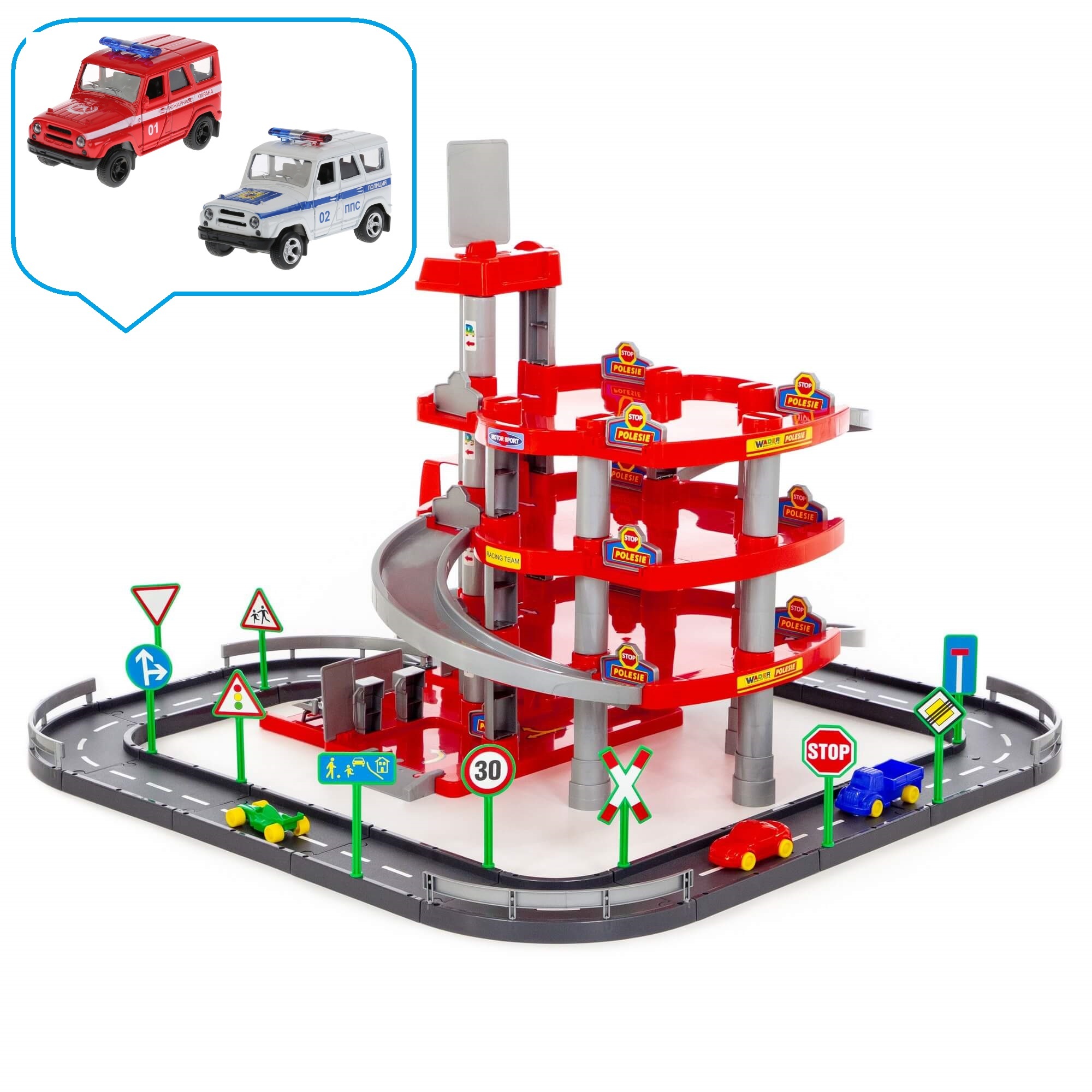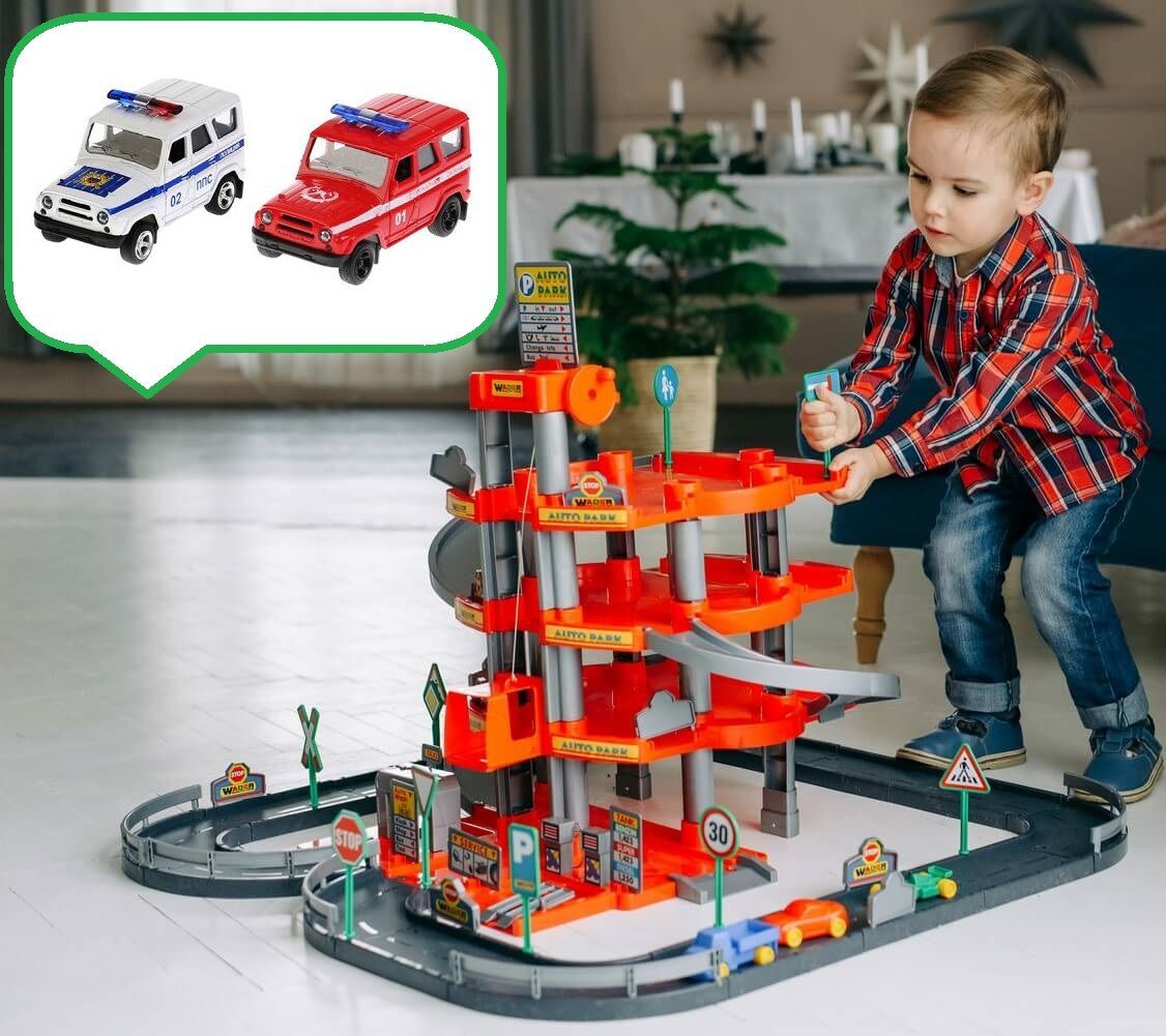 Паркинг 4-х уровневый с дорогой и автомобилями произведен по лицензии немецкой компании Wader из высококачественного пластика.