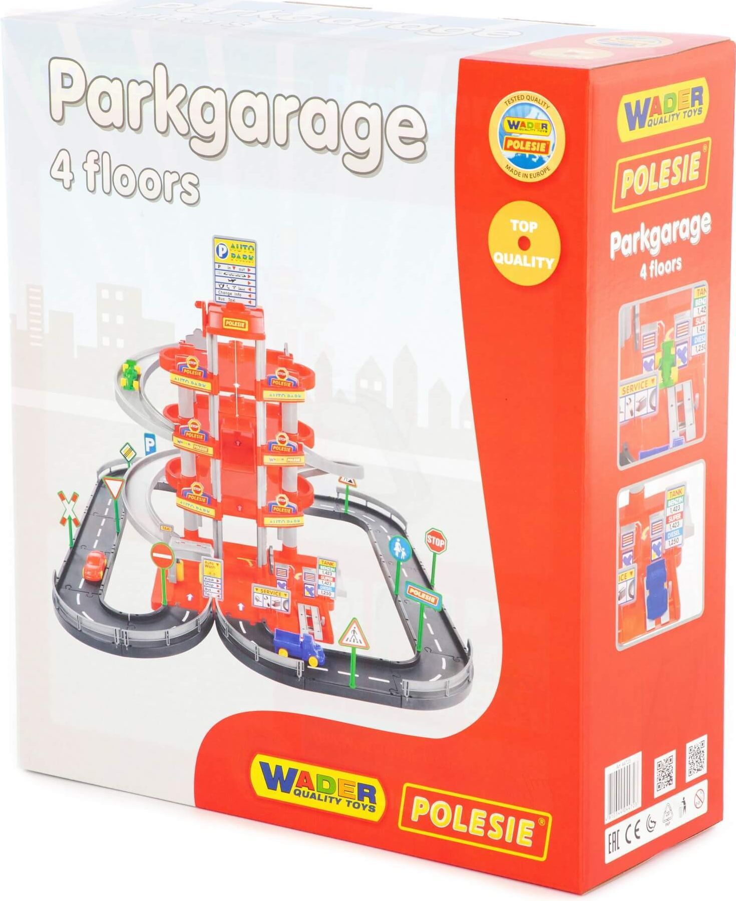 Паркинг 4-х уровневый с дорогой и автомобилями имеет высоту 61 см, ширину - 85 см, глубину - 85 см. С первого на 4-й этаж машинку можно поднять на лифте, а с этажей спуститься по боковым серпантинам. Справа у гаража 2 серпантина с 4-го на 3-й и со 2-го на 1-й этажи, а слева 1 серпантин с 3-го на 2-й этаж. Входы на серпантин прикрыты маленькими дверками. На 1-м этаже автомойка, бензоколонка и гаражный подъемник для ремонта. Справа и слева полукольцом к 1-му этажу паркинга примыкает пластиковая дорога с разметкой, ограждениями и дорожными знаками.