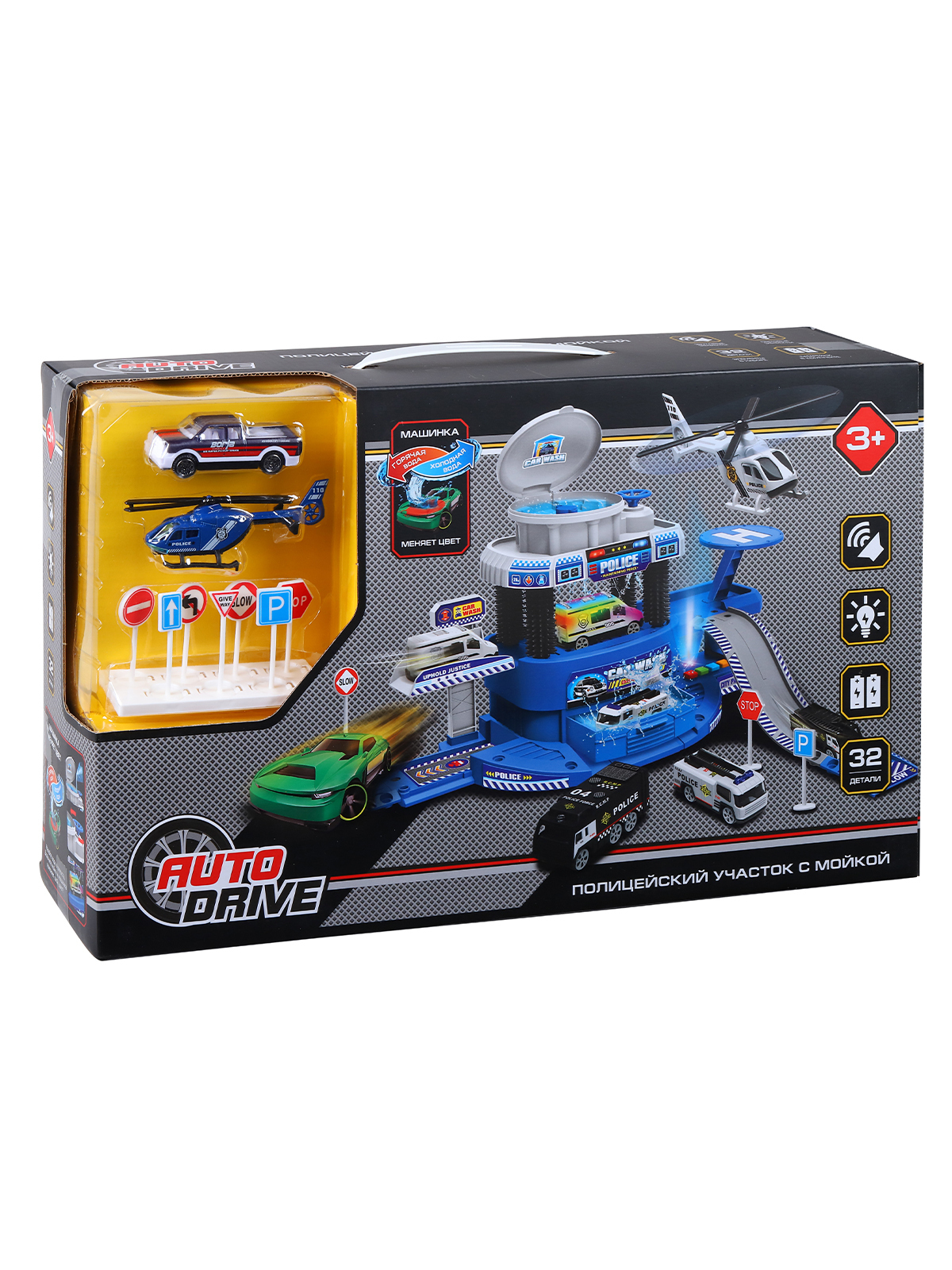 Парковка для машинок AUTODRIVE "Полиция" с автомойкой/ машинка меняет цвет от воды, 32 детали
