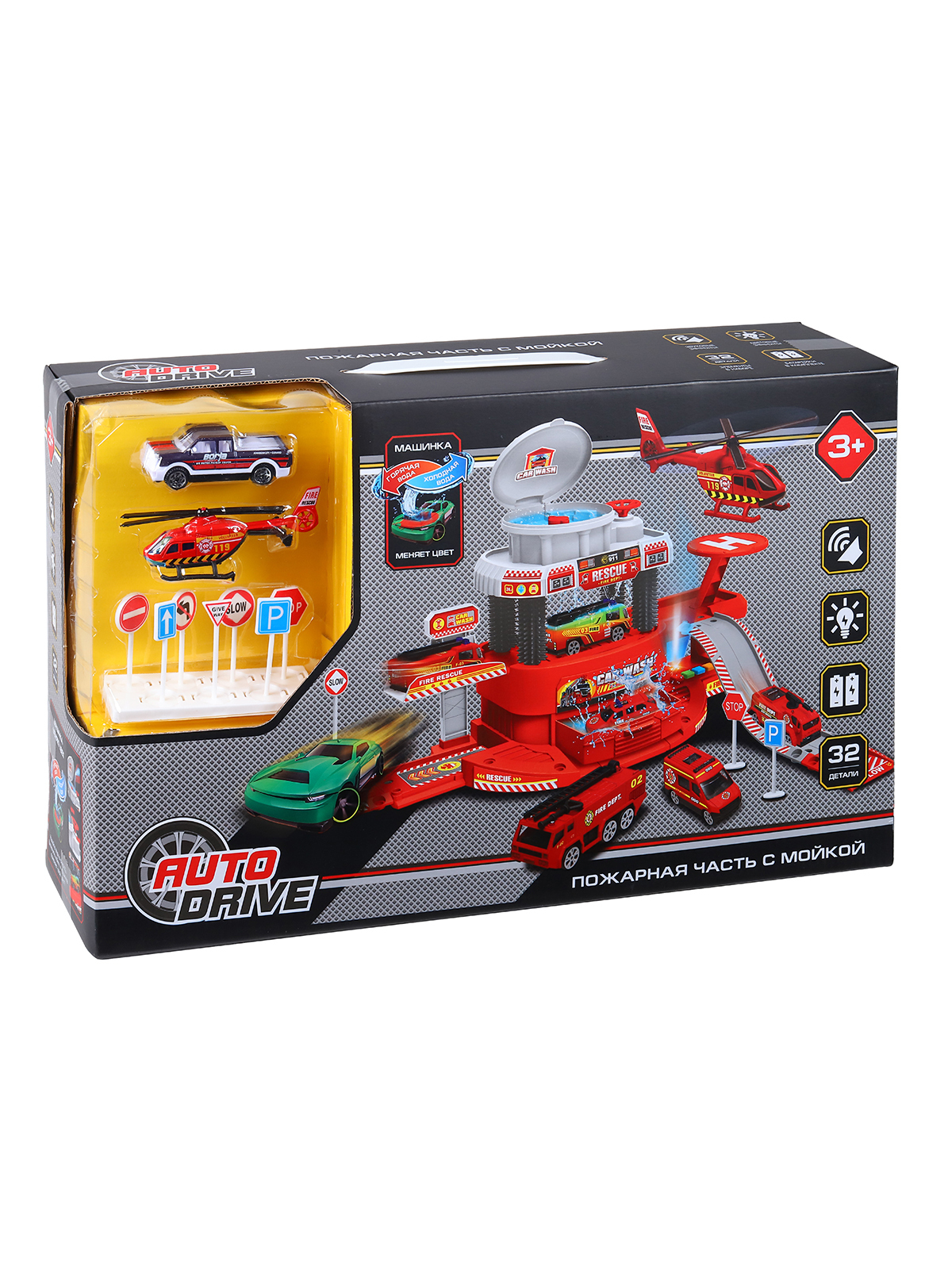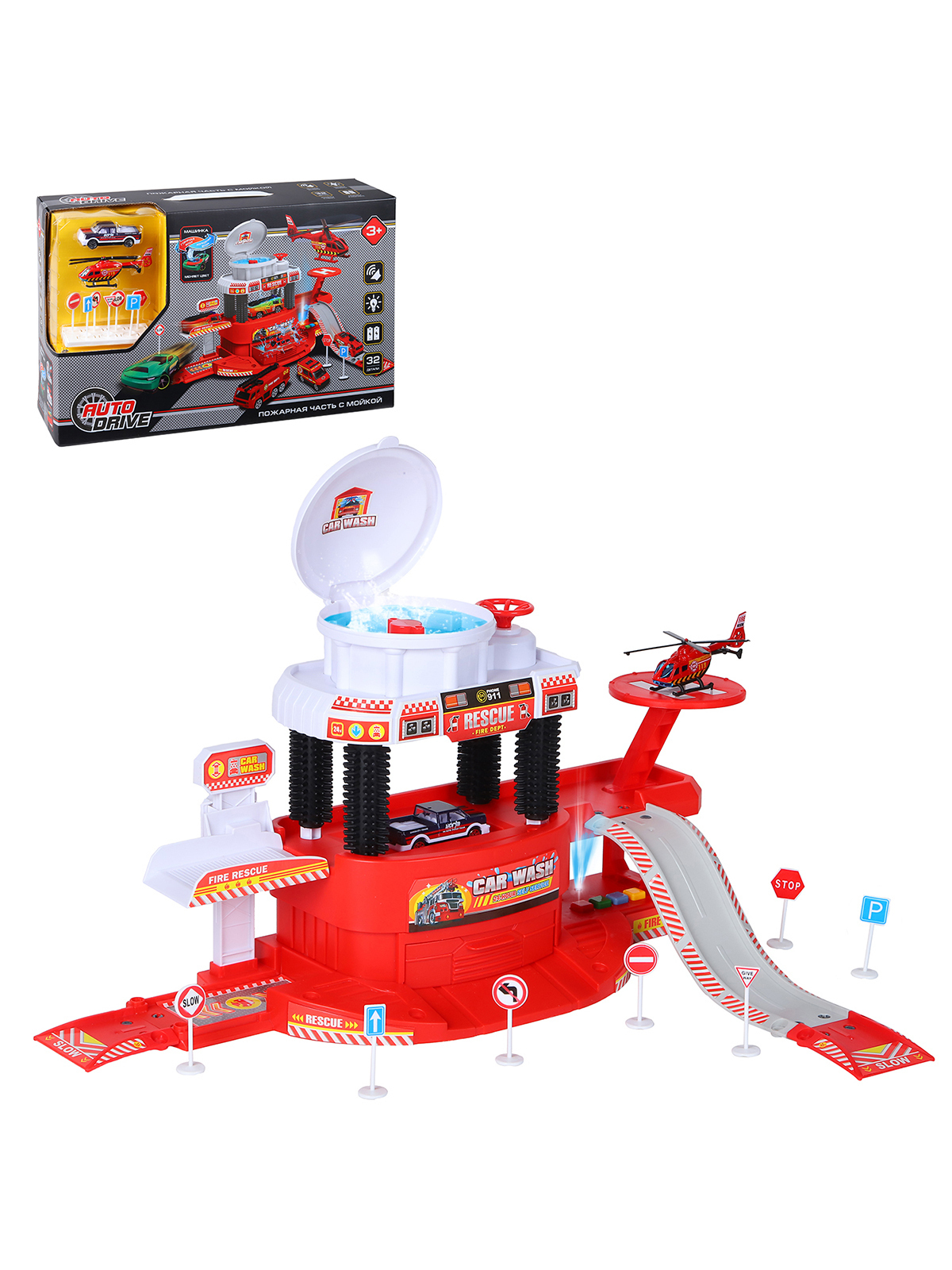 Парковка для машинок AUTODRIVE "Пожарная станция" с автомойкой, машинка меняет цвет от воды, вертолет, 32 детали, многоуровневая