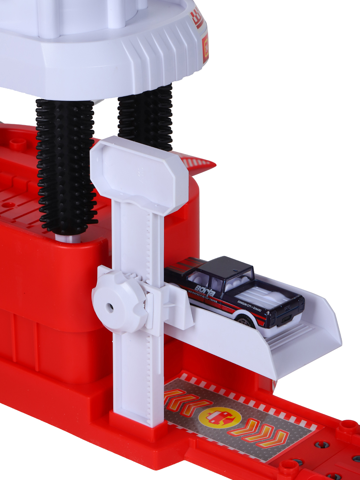 Главная особенность игрушки в том, что в специальный отсек в верхней части парковки можно наливать воду! Во время вращения вентиля вода льётся на нижний уровень со специальной нишей для машинки, откуда поступает в специальную ёмкость для сбора воды. Этой ёмкостью удобно наливать воду в верхний отсек, а ещё в ней тоже можно мыть машинки.