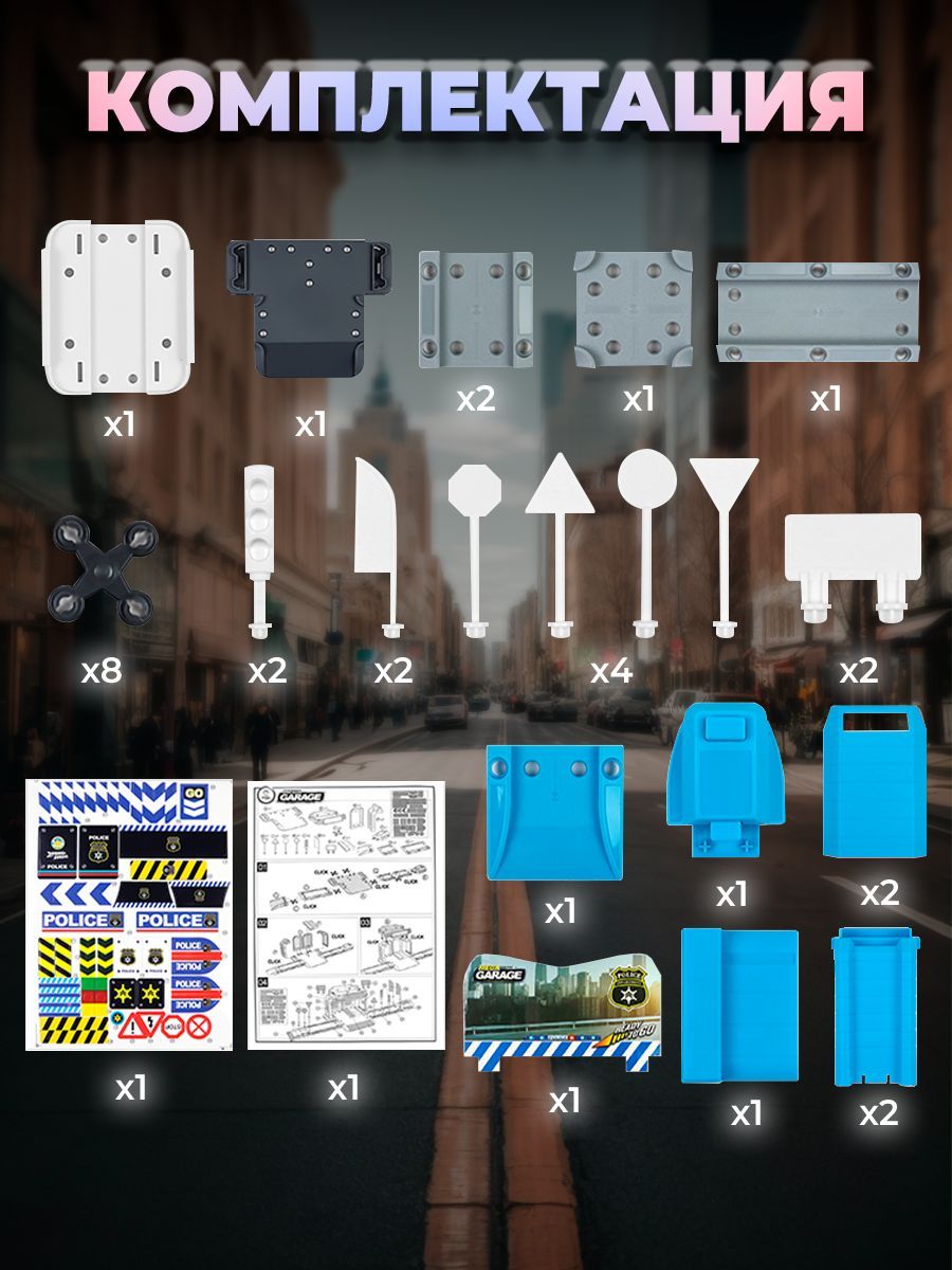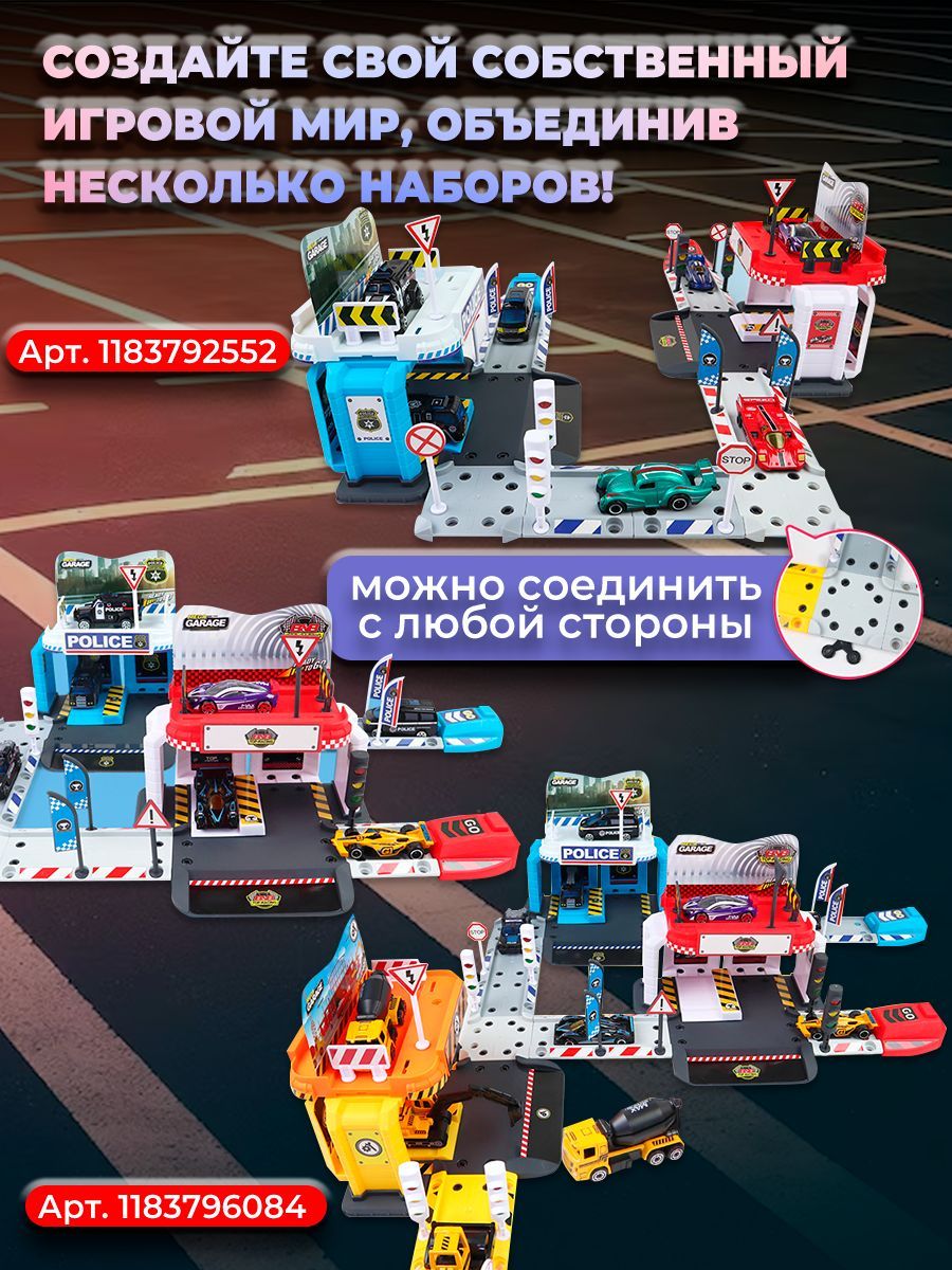 Кроме того, в наборе присутствуют имитация станции технического обслуживания и парковочное место. Ваш ребенок благодаря сюжетно-ролевым играм сможет воплотить сцены ремонта автомобилей, а в гараже хранить свой транспорт после игры. Данные игровые элементы помогают детям развивать навыки управления также заботиться о своих вещах. Каждая деталь набора изготовлена из прочного и безопасного пластика, что обеспечивает надежность комфорт во время игры.
