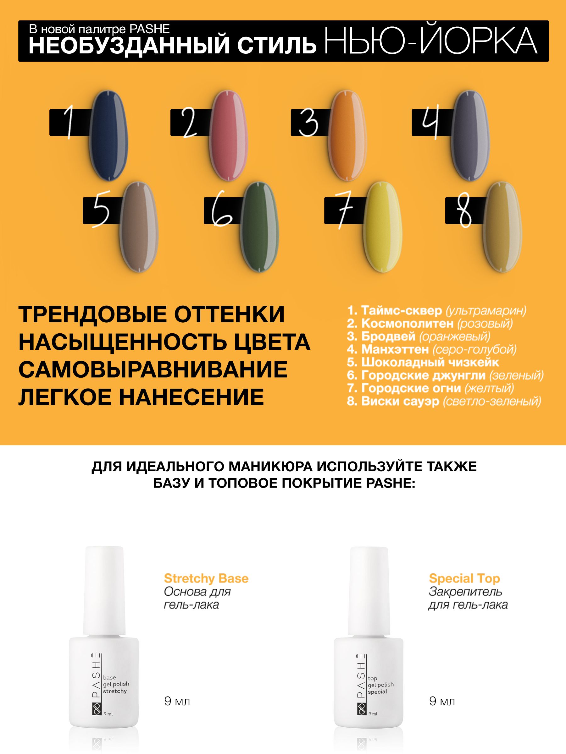 Описание: Необузданный стиль Нью-Йорка и жизнь бизнес-леди в новой палитре PASHE.Днем — небоскребы, бизнес-центры, быстрые такси, а ночью — огни большого города, бары и встречи с подругами. Самая известная fashion-улица мира очаровывает экспрессией, коктейлями, зеленью парков и сиянием Манхэттена. Трендовые оттенки, насыщенность цвета, самовыравнивание и легкое нанесение.