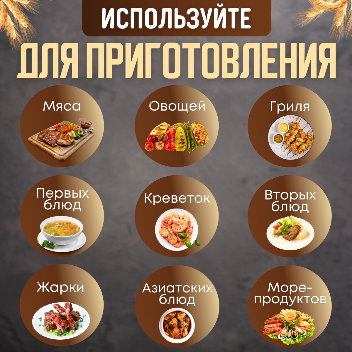 Назначение масла/соуса: Для азиатских блюд, Для вторых блюд, Для гриля, Для жарки, Для креветок, Для морепродуктов, Для мяса, Для овощей, Универсальный