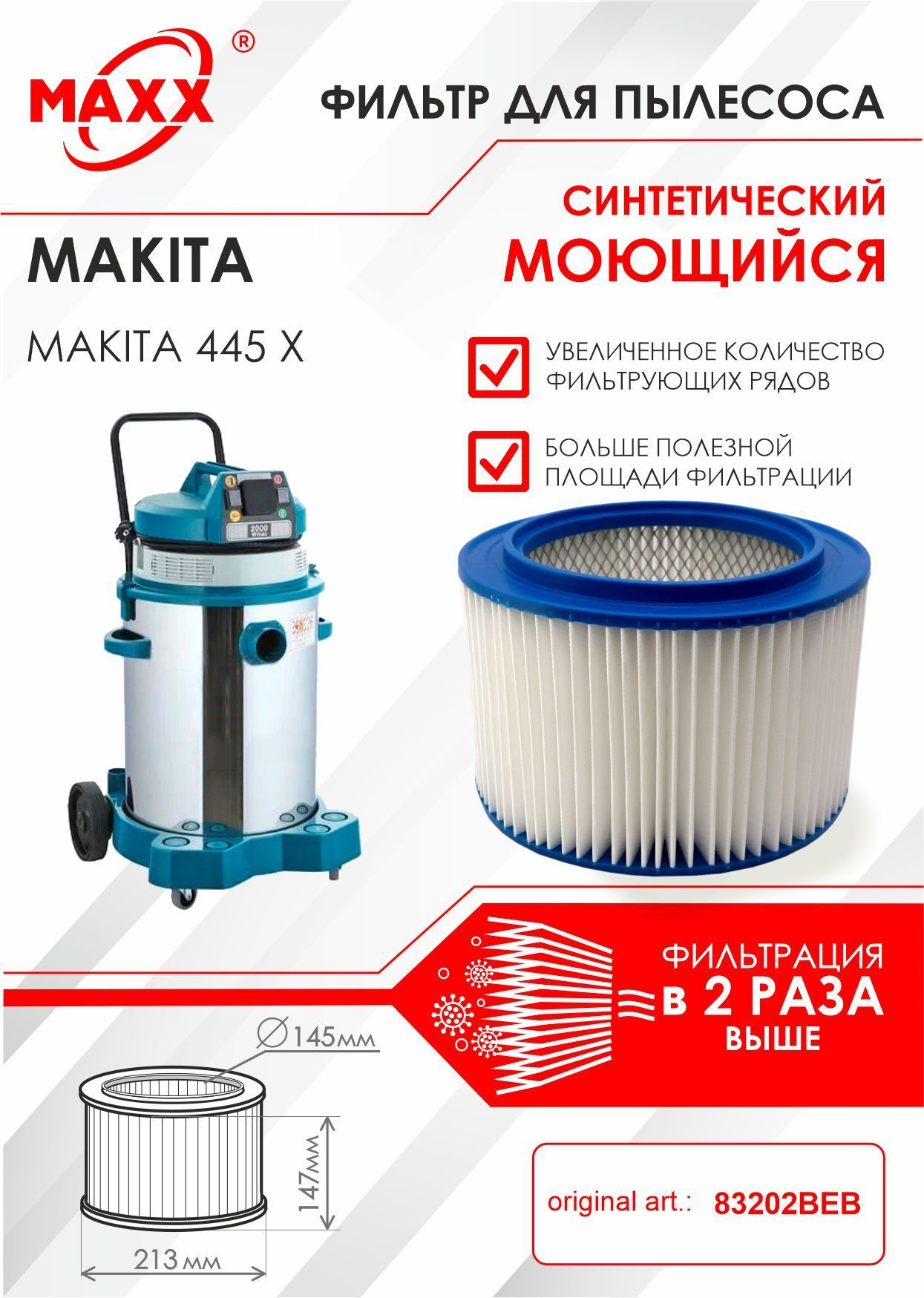 Патронный фильтр PRO складчатый синтетический, моющийся для пылесоса Makita 445 X, 83202BEB