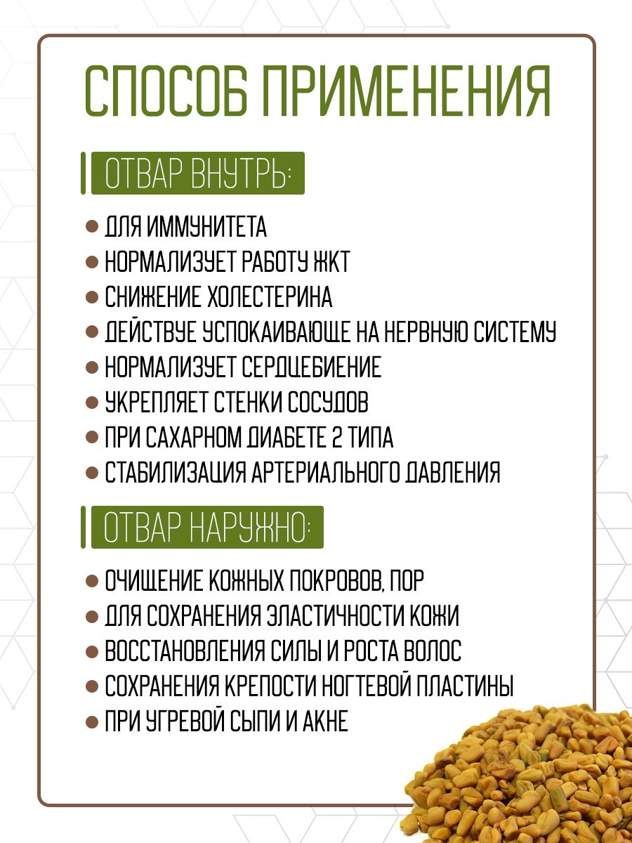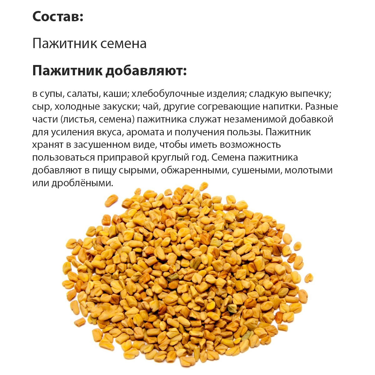 Описание: Текстовое описание изображенияПажитник (Trigonella foenum-graecum) 100%ПОЛЬЗА СЕМЯН ПАЖИТНИКА: укрепляют иммунитет, чистит сосуды, нормализует нервную и сердечно-сосудистую системы повышает устойчивость организма к стрессам защищает суставы от разрушения помогает перерабатывать углеводы и жиры в энергию улучшает работу ЖКТ, почек, органов мочеполовой системыТекст при отключенной в браузере загрузке изображенийПрименение: 1 чайную ложку семян Шамбала залейте 0,2 л кипятка, настоять 2 часа, процедить.