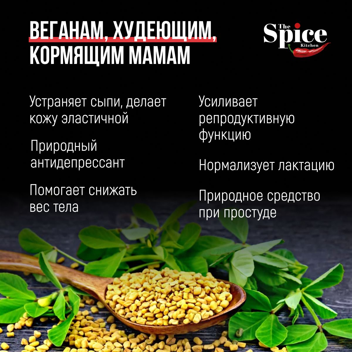 Пажитник богат белком, витамином PP, полезными жирными и эфирными маслами, алкалоидами и флавоноидами. Регулярное употребление благотворно влияет на работу сердца и органов пищеварения, также его часто используют при диабете, чтобы контролировать уровень сахара в крови. Содержит: