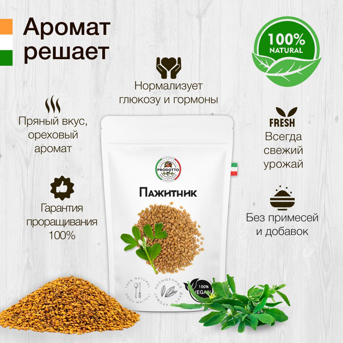 Описание: Пажитник - пряность растительного происхождения, обладает сладким вкусом с ореховыми нотками и горчинкой, а также травянистым ароматом. Чаще его используют в качестве натурального загустителя для подливы и соусов, но он также широко применяется для приготовления гарниров и супов.
