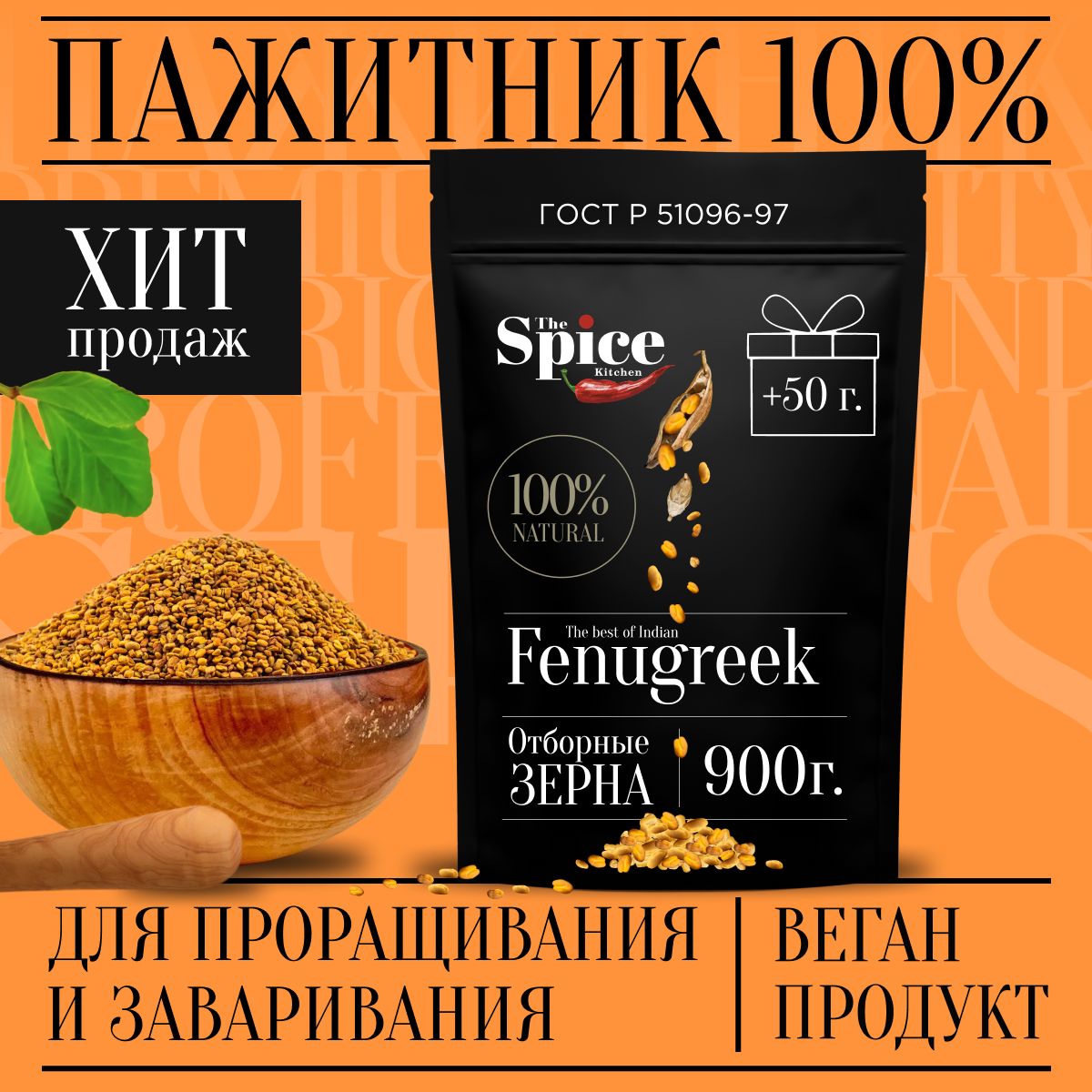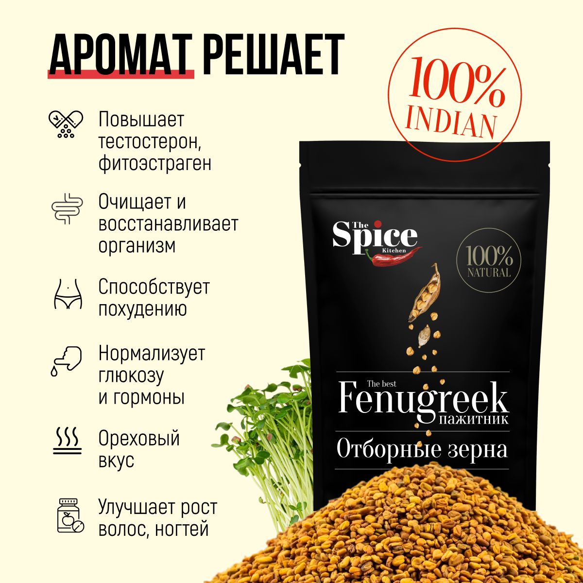 Описание: Пажитник - пряность растительного происхождения, обладает сладким вкусом с ореховыми нотками и горчинкой, а также травянистым ароматом. Чаще его используют в качестве натурального загустителя для подливы и соусов, но он также широко применяется для приготовления гарниров и супов.