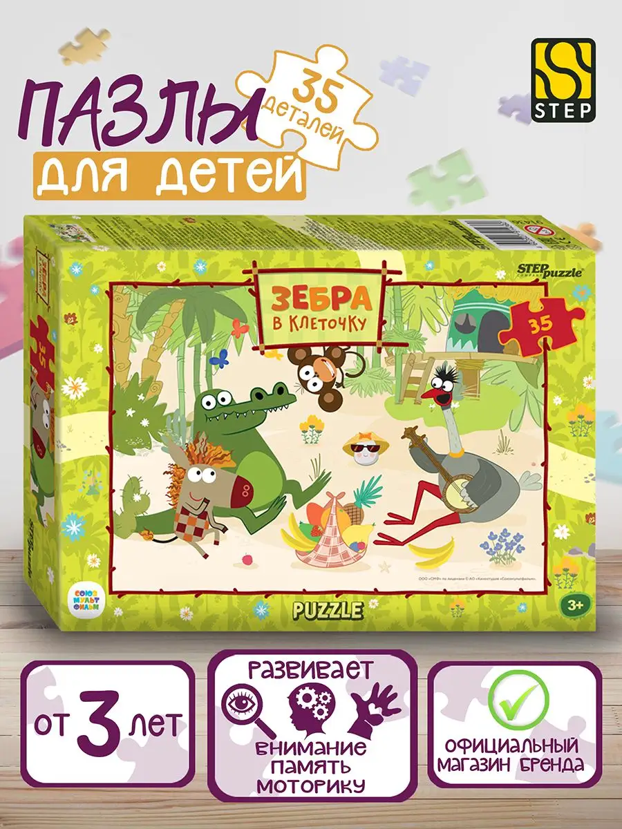 Описание: "Кто носит юбку в клеточку, кто маечку в горошек. Но главное всем хочется - найти друзей хороших" - песней с такими словами начинается популярный мультфильм "Зебра в клеточку". А найти этих самых друзей - главных героев мультфильма можно в новой серии пазлов. Собрав картинку из 35 деталей, перед малышами появятся зебра Клеточка, крокодил Гоша, обезьянка Яна, страус Паша и его брат, который еще не вылупился из яйца, Петя. Размер собранной картинки - 33 х 23 см. Пазл подойдет для детей от 3 лет. Герои: Клеточка Яна Поля Гоша Родион Паша Петя Пазлы от Step Puzzle - это игры для детей от 3 лет (они также подойдут малышам, которым 3 года и 4 года). Мозаика станет отличным подарком для ребенка любого возраста, для мальчика и для девочки. Пазл можно презентовать на 23 февраля, 8 марта, День рождения, а также Новый год и Рождество. Пазл удобно взять с собой в путешествие, в машину, на прогулку или в гости. Пазл выбирают для детского творчества и досуга, а также в качестве настольной игры для компании и всей семьи. Главной задачей при производстве пазлов является здоровье и безопасность вашего ребенка, поэтому делая игры для малышей, мы используем экологичные и безвредные для детей материалы. Все элементы мозаики качественные и яркие, прочные. Детали пазла идеально подходят для маленьких детских ручек: они не выскальзывают, легко соединяются и ровно ложатся. Пазлы - отличный помощник для раннего развития ребенка. Оригинальные пазловые замки помогут понять, правильно ли ребенок собрал пазл, а интересные картинки не оставят малыша равнодушным. Собирая пазл ребенок будет развивать мелкую моторику, память и внимание, а также зрительное восприятие, речь, усидчивость, логику и пространственное мышление. Пазлы также обладают антистресс эффектом: снижают напряжение и эмоциональное перевозбуждение ребенка.