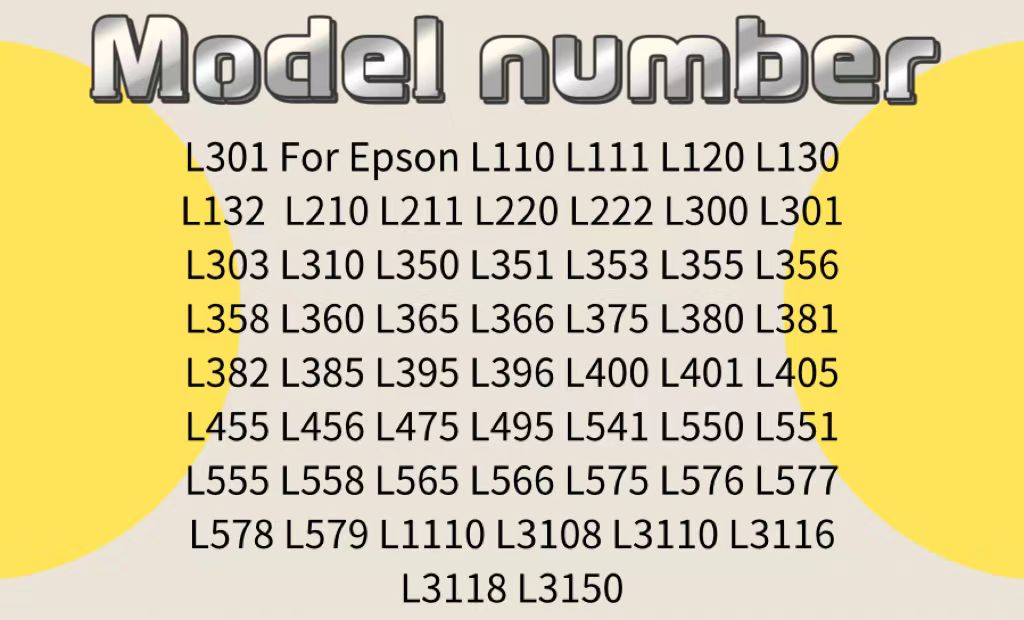 • Epson EPSON L110 L111 L120 L211 L210 L220 L300 L301 L303 L335 L350 L351 L353 L355 L358 L365 L381 L400 L401 L455 L541 L551 L555 XP300 XP302 XP306 XP305 XP406 XP410 XP412 XP413 XP415 WF2520 WF2521 WF2530 WF2531 WF2540 WF2541 WF2630 WF2640 WF2650 WF2660 WF2010 WF2510 PX300 PX435A ET-2500 ET-2550 ET-4500 ET-4550 L310 XP452 L310 XP241 L360 L550 L395 L375 XP241 L382 L550 L130 L222 XP422 XP342 XP352 L1110 L4150 L222 L575 XP375 L3118 L3168 L3151 L4116 l3117 L4167 L4165 L132 L130 L220 L360 L380 L382 L362 L366 L456 L551 L565 L566 XP-332 WF-2630 XP2444A