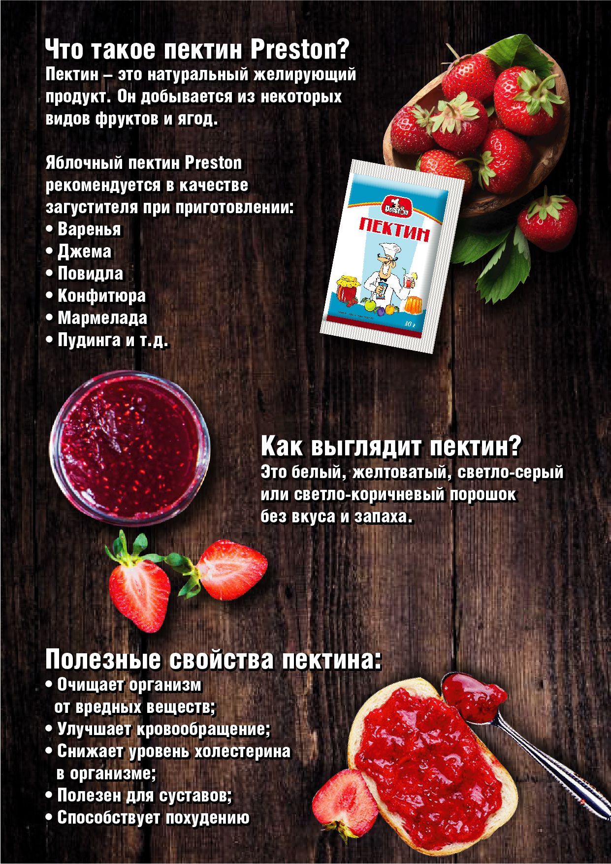 В России пектин чаще всего добывают из яблока и свеклы. Он обладает свойствами стабилизатора, гелеобразователя, осветлителя, загустителя и содержит фосфор, калий, железо, магний, кальций, ниациновый эквивалент РР, особенную ценность веществу придает высокое содержание натрия (до 430 мг).