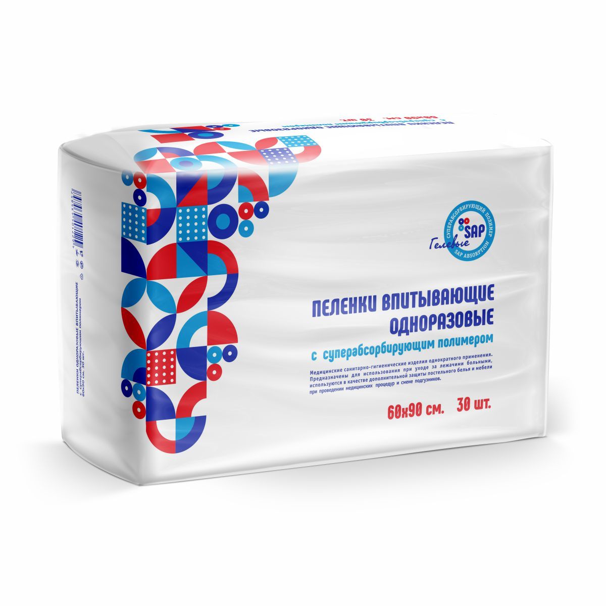 Пеленки впитывающие одноразовые с суперабсорбентом состав : нетканный материал, впитывающий слой из распушенной целлюлозы и гелеобразующего суперабсорбента (SAP) внутри, 2-х слоев специальной бумаги.