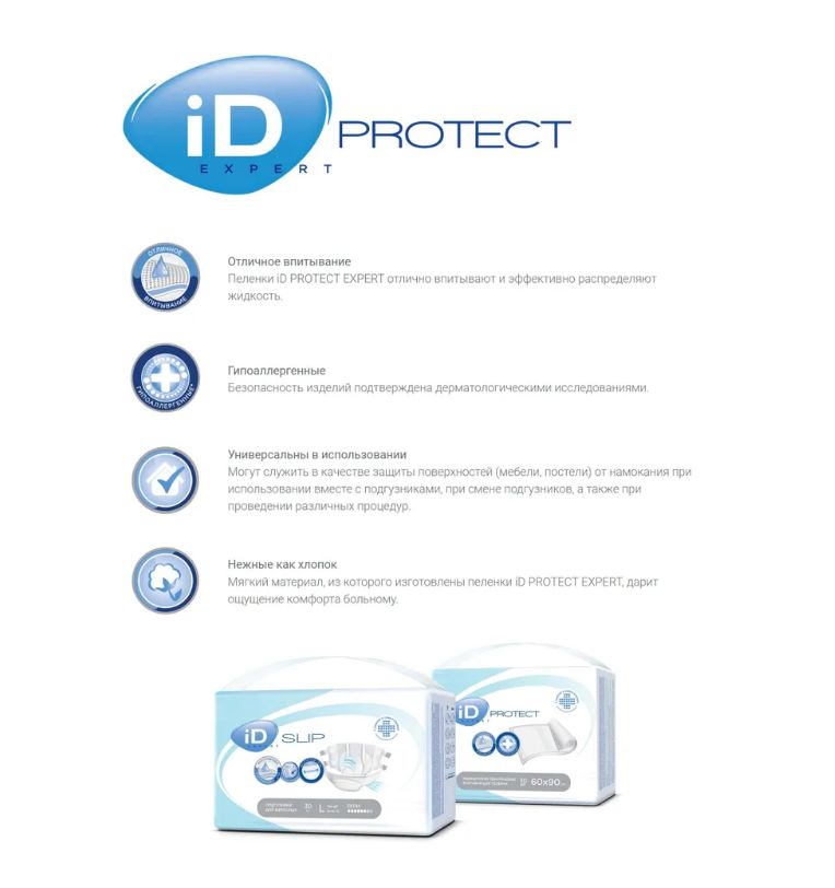 Описание: Впитывающие пеленки ID Protect универсальны в использовании, они могут служить в качестве дополнительной защиты различных поверхностей (например, постельного белья, мебели) от намокания при использовании вместе с подгузниками, впитывающими трусами и урологическими прокладками, при смене подгузников, а также при проведении различных процедур. Они отлично впитывают и эффективно распределяют жидкость. Верхний слой пеленок выполнен из мягких, как хлопок, материалов, что обеспечивает комфорт при использовании, а нижний слой - из полиэтиленовой пленки, что исключает протекания.