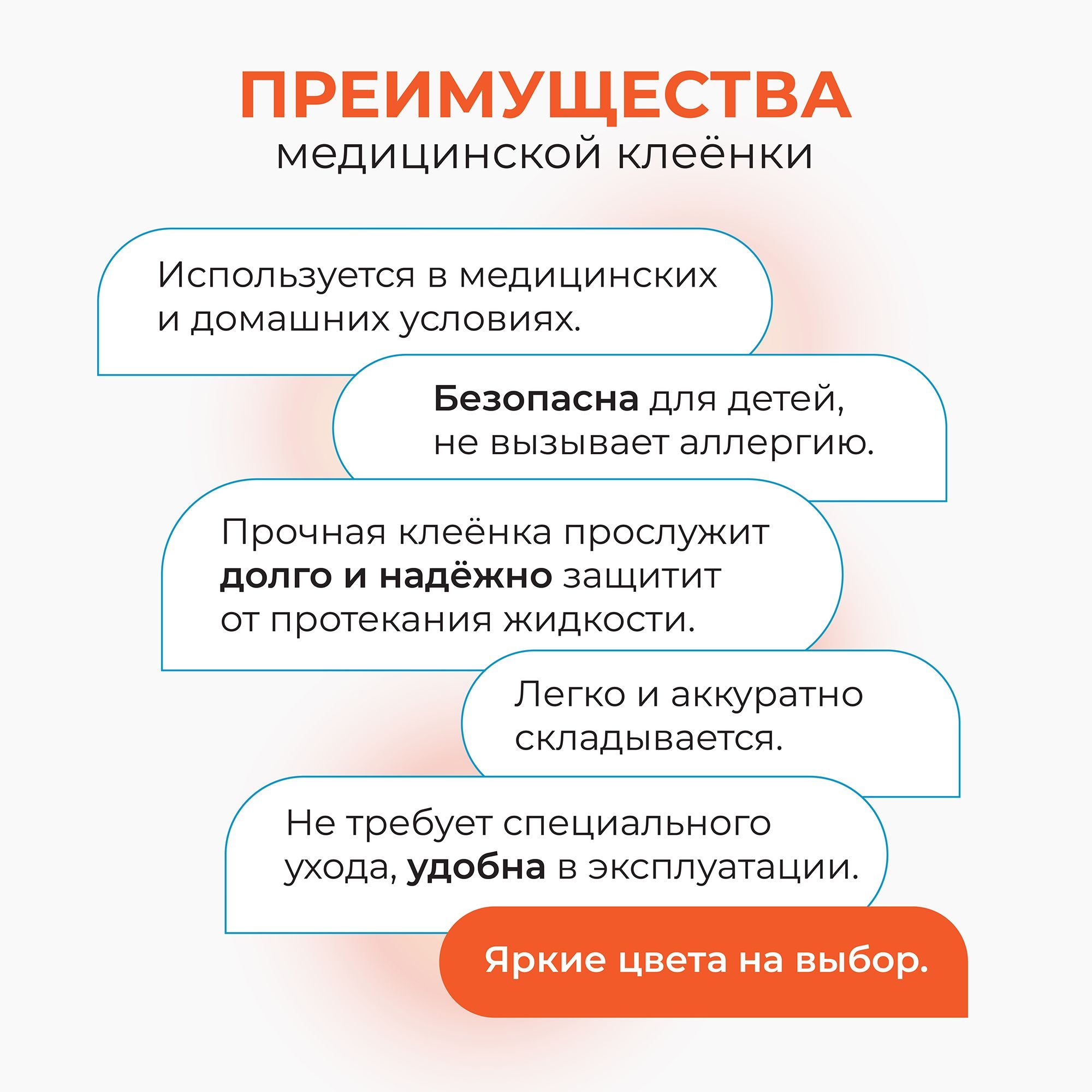 Описание: Клеенка подкладная с ПВХ-покрытием, многоразовая 100х140 см. Клеенка детская. Непромокаемая клеенка применяется в медицинских и бытовых целях. Медицинская клеенка используется при уходе за детьми, защищает матрас от влаги. Благодаря тканевому слою клеёнка не скользит. Обладает высокой теплопроводимостью, быстро приобретает температуру тела, у изделия отсутствует эффект "холодного прикосновения". Экономичная - подходит для многоразового применения. Нанесение ПВХ предохраняет от проникновения влаги и вместе с этим делает клеенку дышащей. Применение: положите клеенку тканевой стороной на защищаемую поверхность, при необходимости сверху накройте простыней. Клеенка Колорит имеет яркий красивый цвет, приятная на ощупь, не склеивается. Подходит для ухода за детьми, лежачими больными, животными. Товар сертифицирован. Сделано в России. Клеенки предложены в шести цветах (белый, синий, желтый, оранжевый, зеленый, розовый) и в двух размерах (100х140 см и 200x140 см).