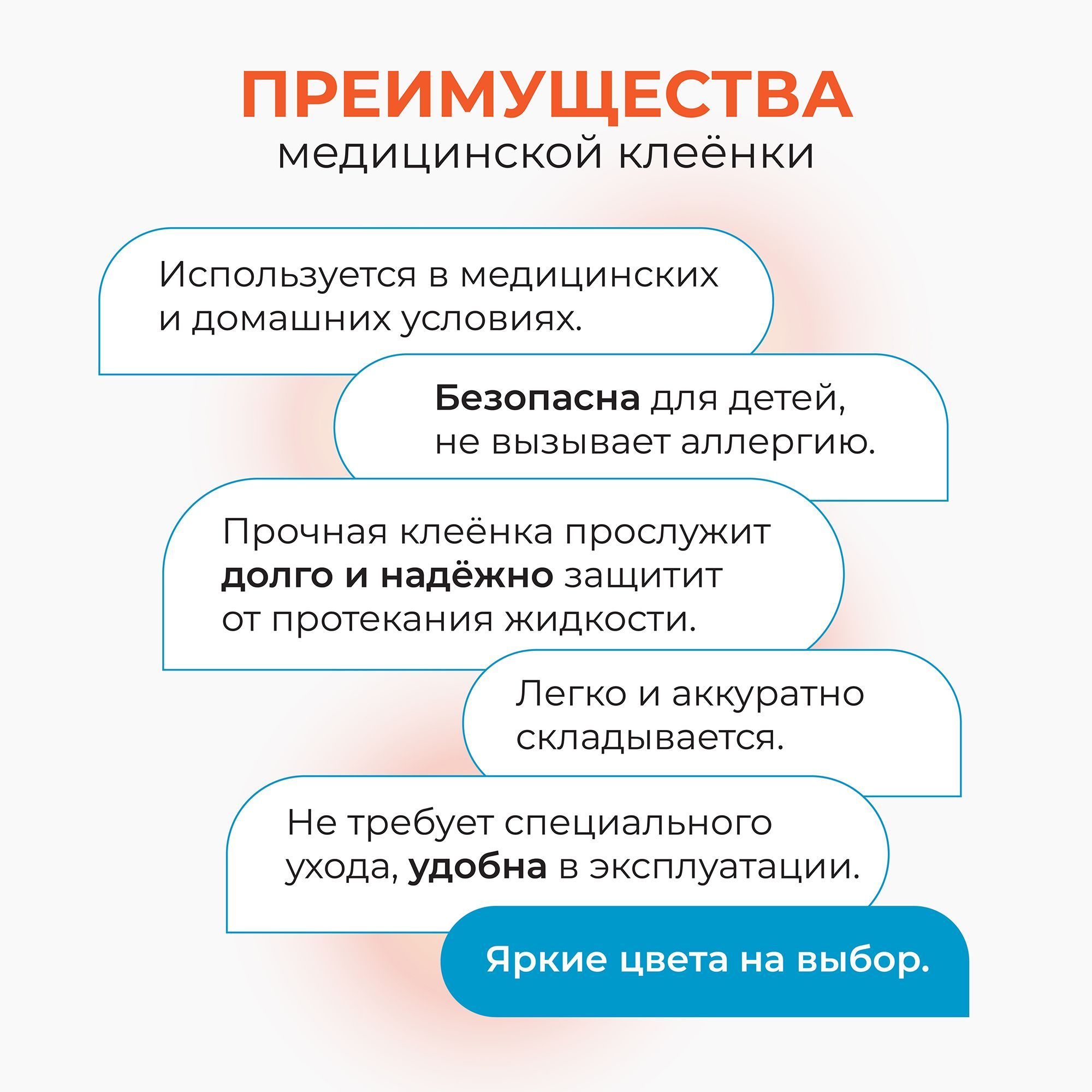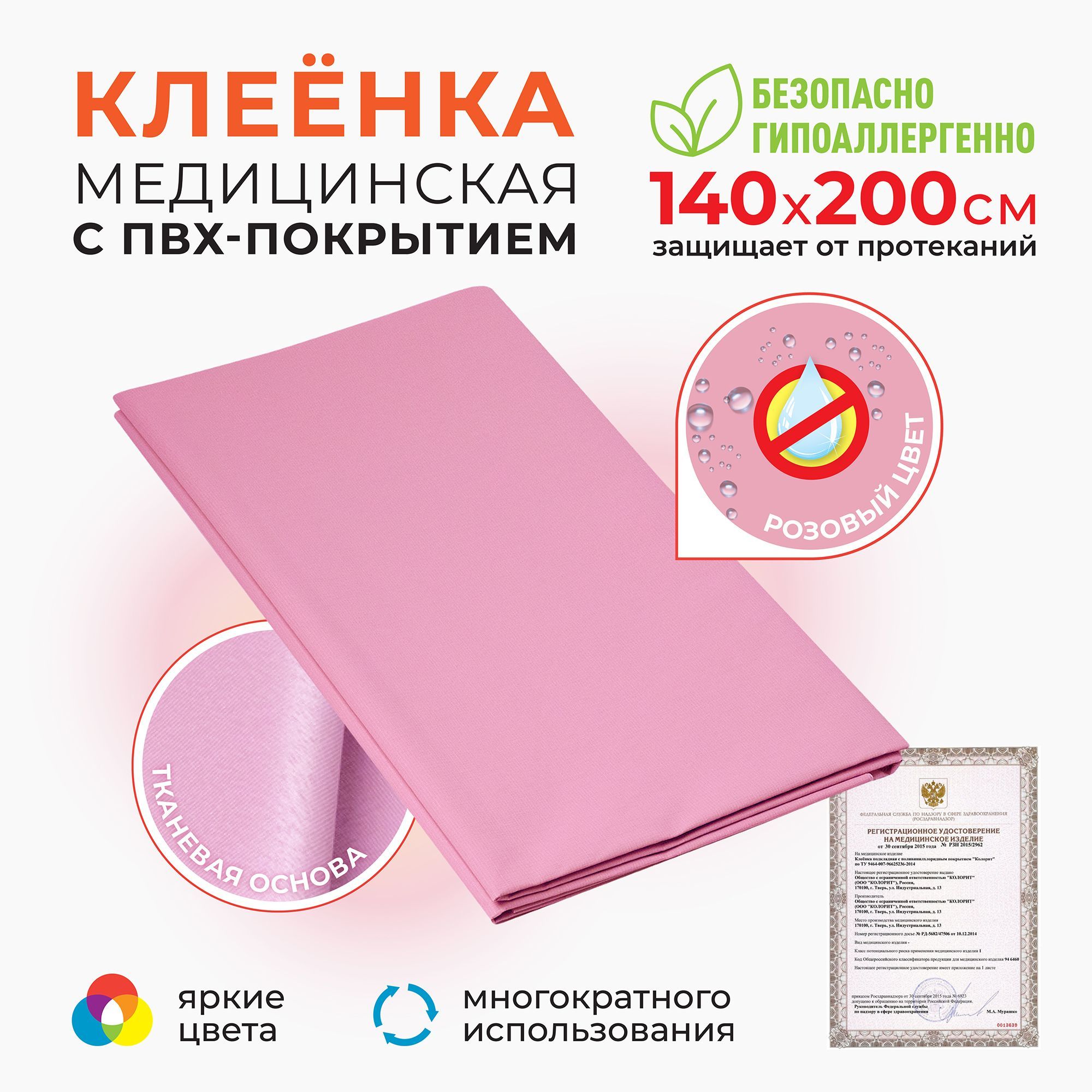 Описание: Клеенка подкладная с ПВХ-покрытием, многоразовая 200х140 см. Клеенка детская. Непромокаемая клеенка применяется в медицинских и бытовых целях. Медицинская клеенка используется при уходе за детьми, защищает матрас от влаги. Благодаря тканевому слою клеёнка не скользит. Обладает высокой теплопроводимостью, быстро приобретает температуру тела, у изделия отсутствует эффект "холодного прикосновения". Экономичная - подходит для многоразового применения. Нанесение ПВХ предохраняет от проникновения влаги и вместе с этим делает клеенку дышащей. Применение: положите клеенку тканевой стороной на защищаемую поверхность, при необходимости сверху накройте простыней. Клеенка Колорит имеет яркий красивый цвет, приятная на ощупь, не склеивается. Подходит для ухода за детьми, лежачими больными, животными. Товар сертифицирован. Сделано в России. Клеенки предложены в шести цветах (белый, синий, желтый, оранжевый, зеленый, розовый) и в двух размерах (100х140 см и 200x140 см).