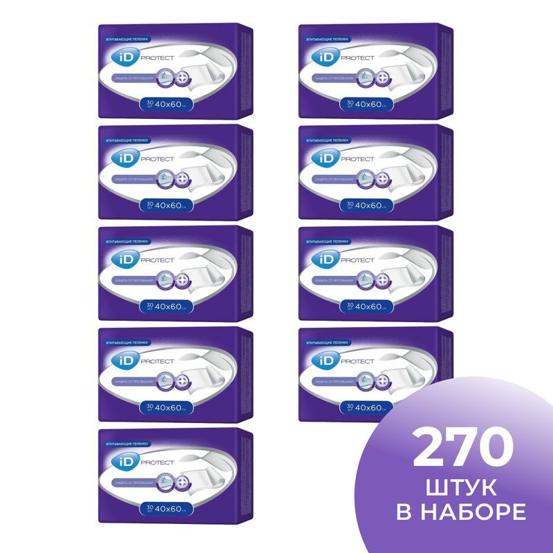 Пеленки одноразовые 40х60 см для взрослых и детей iD Protect - 270 шт (набор из 9 уп по 30 шт в коробе)