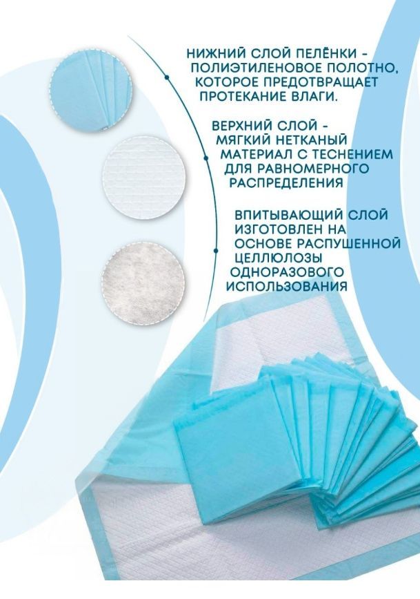 Способ примененияРаскройте пеленку и разложите ее на плоской поверхности. Расправьте простыню и расстелите на постели/кушетке. При уходе за лежачим пациентом используйте простыни во время смены подгузника. После очищения кожа должна полностью высохнуть перед надеванием чистого подгузника, и на это время простыня защитит постель от загрязнений. Соблюдайте правила гигиены. Перед сменой пеленки вымойте руки, чтобы избежать попадания бактерий на пеленку.Правила хранения и использования пеленкиНе храните пеленки в ванной комнате или во влажных помещениях, т.к. они являются гигроскопичным продуктом и впитывающие свойства пеленок могут быть ухудшены или нарушены, избегать воздействия на пеленки прямых солнечных лучей. Рекомендуется хранить в сухих и теплых помещениях.