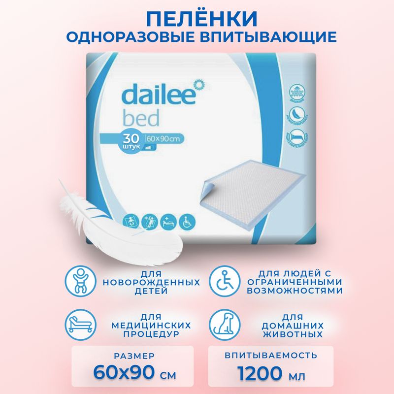 Dailee Пеленки одноразовые впитывающие 60х90 см для взрослых, новорожденных, лежачих больных, для детей, для животных - 30 шт в 1 упаковке