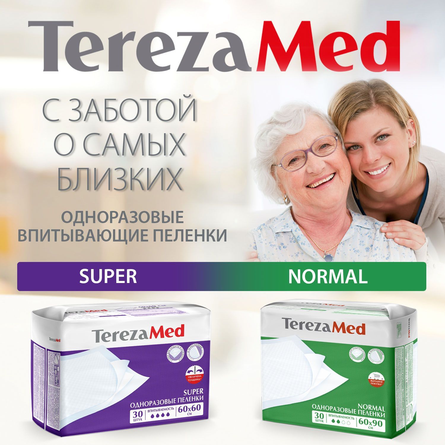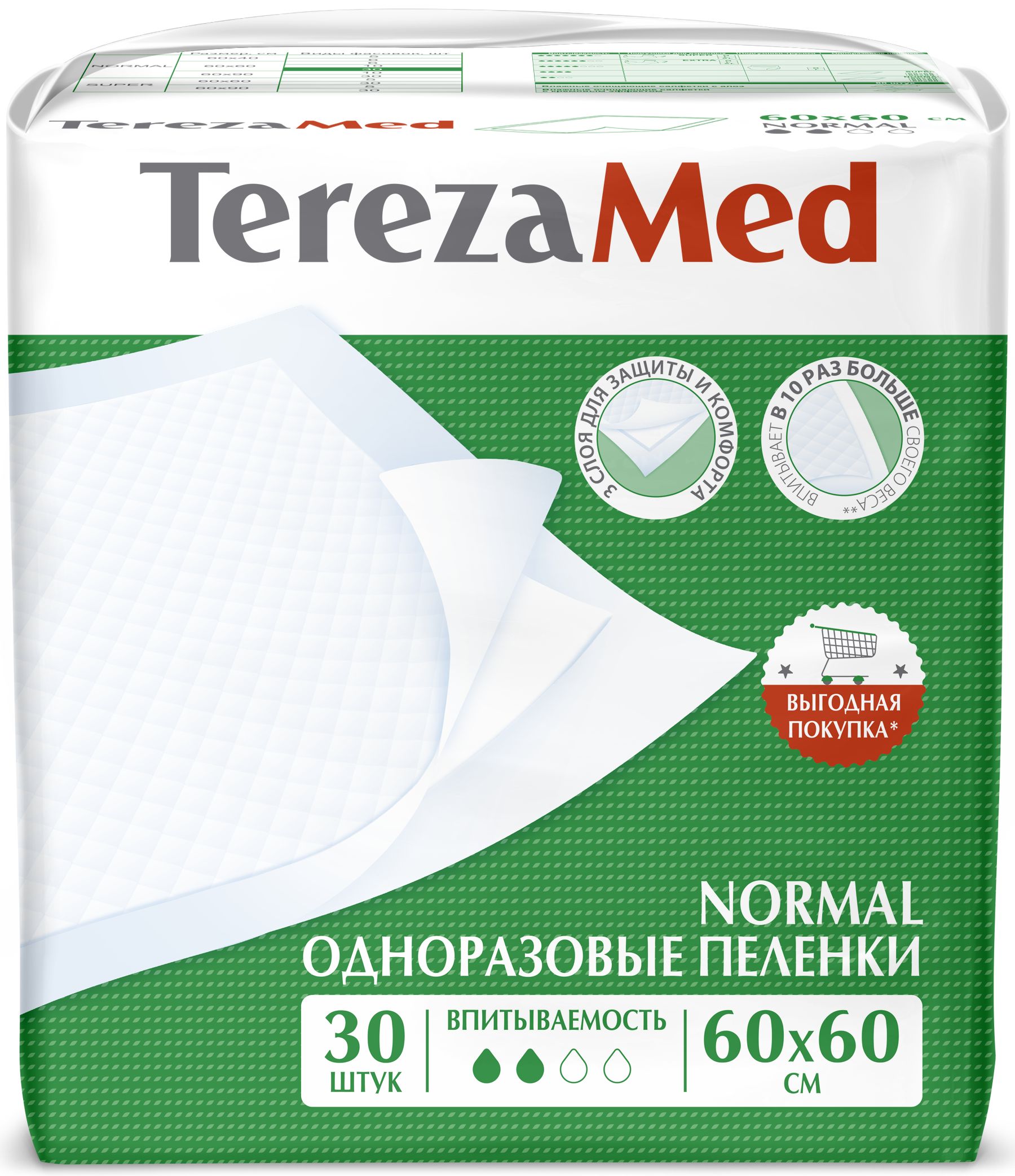 Линейка пеленок TerezaMed включает в себя продукты с несколькими уровнями впитываемости: Normal и Super, а также размерами: 60х60 и 60х90