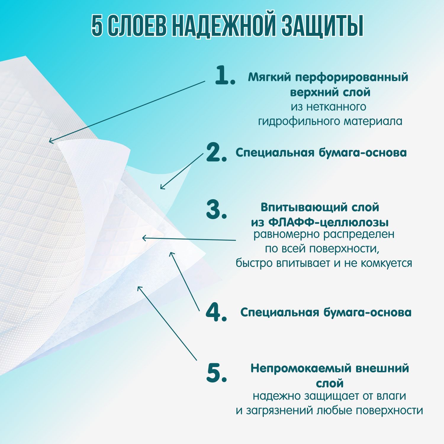 Универсальные пеленки состоят из мягкого верхнего слоя с перфорацией, мгновенно пропускающего жидкость внутрь изделия. Внутренний слой из распушенной целлюлозы, расположенный между двух слоев впитывающей бумаги, обеспечивает равномерное распределение жидкости внутри. Защитный нижний слой препятствует протеканию на любые поверхности.