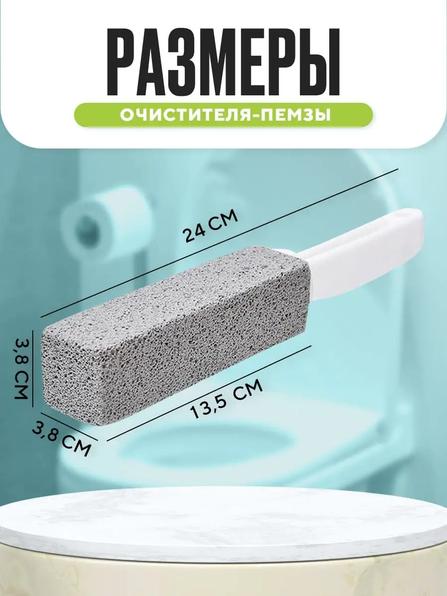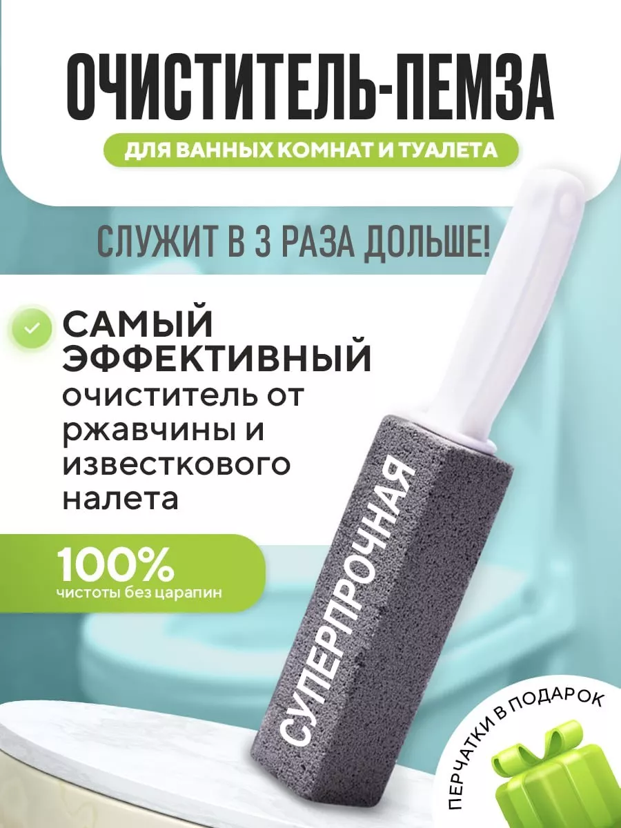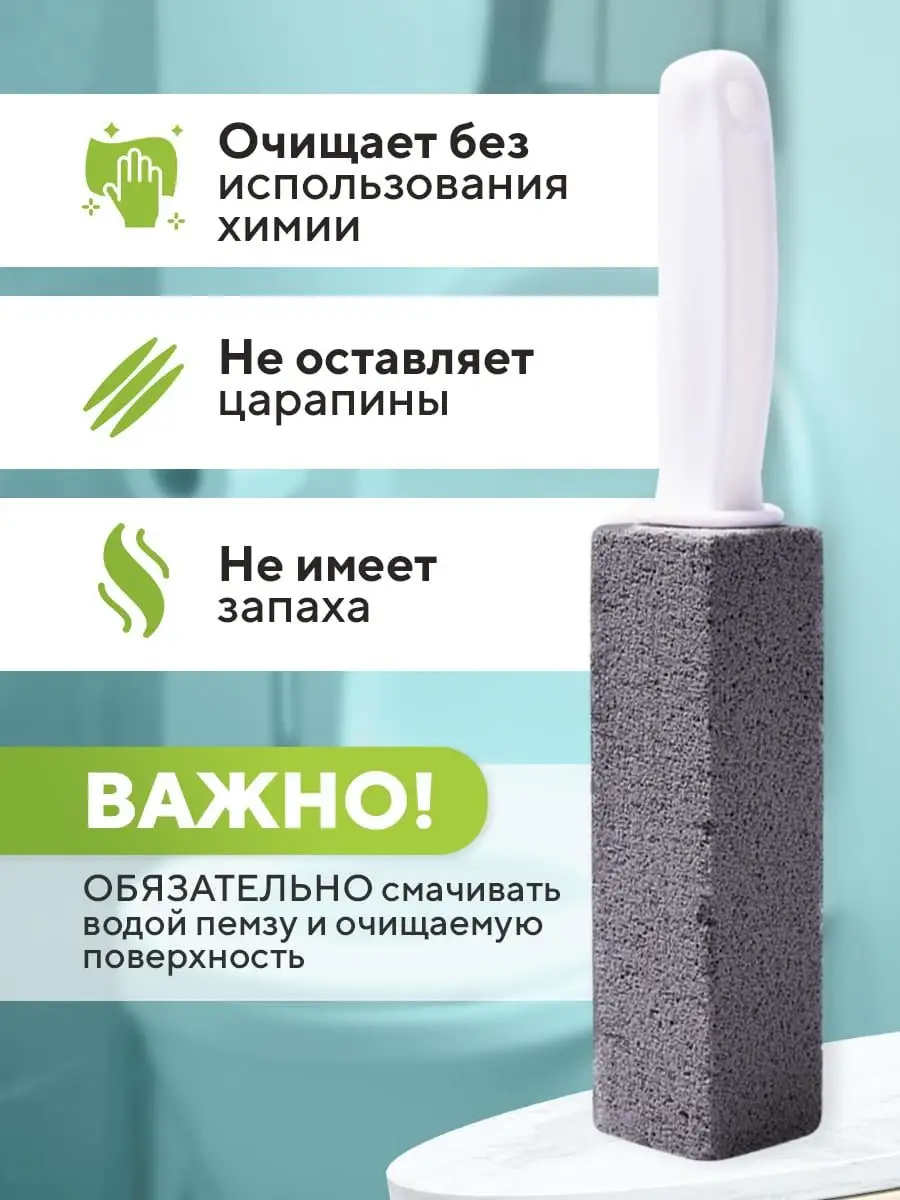 Описание: Суперпрочная пемза очиститель показывает отличный результат при удалении ржавчины и налета, но в отличии от хрупких аналогов не крошится и стирается в три раза дольше! Ершик пемза для ванных комнат и туалетов - самый эффективный очиститель от ржавчины и известкового налета. Это универсальное чистящее средство обеспечит стопроцентную чистоту для ванны и туалета. Пемза с ручкой для чистки унитаза от ржавчины очищает без использования химии, не оставляет царапины, не имеет запаха и является экологически чистым продуктом. Перед использованием ершика с ручкой, очищаемую поверхность и пемзу необходимо обязательно смачивать водой, чтобы без труда удалить любые стойкие загрязнения . Этот аксессуар для туалета отлично справляется с известковым налетом, солевыми отложениями, плесенью и ржавчиной, а также отличное средство для удаления мочевого камня в унитазе. Область применения такого очистителя: кафель, унитазы, раковины, ванны и прочие бытовые предметы. Не применять этот очиститель для унитаза, на акриле, стеклокерамике и хромированных изделиях. Размеры супер очистителя пемза, позволяют его эффективно использовать, а пластиковая ручка удобно держать. При использовании этого средства от налета в туалете и ванне, вы наглядно увидите результат до и после применения. Для труднодоступных мест, пемзу для удаления налета на унитазе можно отрезать простым ножом под нужным углом, что позволит более эффективно ее использовать. С этим средством для удаления известковых налетов и ржавчины, уборка санузлов в доме станет намного легче и результативней. Все домохозяйки использующие для сантехники чистящие средства, однозначно выбирают данный туалетный аксессуар, как очиститель ржавчины на унитазе и советуют его при самых трудных случаях загрязнения унитаза. Ершик для унитаза с насадкой из пемзы не занимает много места, прост в применении и безопасен для детей. Это средство для удаления известковых отложений и ржавчины сэкономит нервы и время каждой домохозяйке. Если вы перепробовали кучу чистящих средств для сантехники, и они не дали результат, то смело берите этот очиститель унитаза. Где бытовая химия для туалета и другие средства для очистки сантехники не справляются, пемза избавит от налета и ржавчины в туалете и ванной комнате, без труда очистив поверхность до блеска. Этот очиститель унитаза без хлора, универсальное средство для уборки, которое отлично подходит не только для туалета и ванны, но также и для плитки на кухне как антижир, гриля барбекю, бассейнов, раковин или душевых. Пемза также поможет при очистки духового шкафа и противня от нагара и жира, без труда справится с чисткой шампуров, решеток для мангала, барбекю, сковород и кастрюль. Приобретая это средство от известкового налета, вы получаете не только универсальное средство для сантехники, пенопемза легко избавит от налета и ржавчины, копати и нагара, жира и плесени. Не все средства от налета в ванной и от ржавчины в ванной, могут справится с трудными загрязнениями, но пемза для сантехники средство незаменимое. Щетка для мытья унитаза не просто чистящее средство для сантехники, это супер средство и великолепный очиститель ржавчины. Эта чудо пемза от налета и ржавчины на унитазе самый экологичный очиститель и незаменимое средство для мытья унитаза, котора