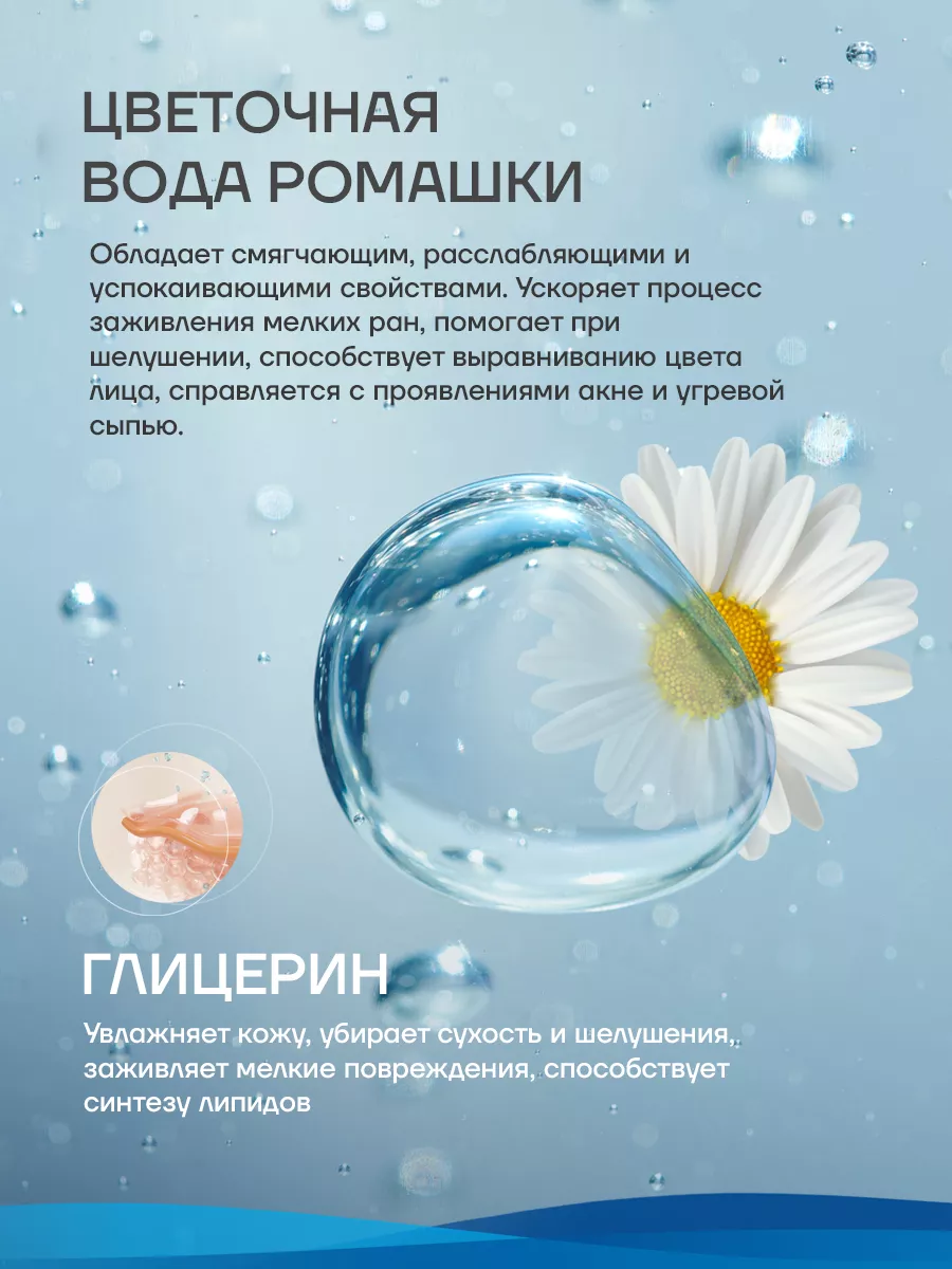 Артикул 151936874 Состав гидролат ромашки; вода очищенная; Лаурил саркозинат натрия; кокоглюкозил; поликвартерниум; консервант шаромикс; отдушка; кокамидопропил бетаин 45%; глицерин