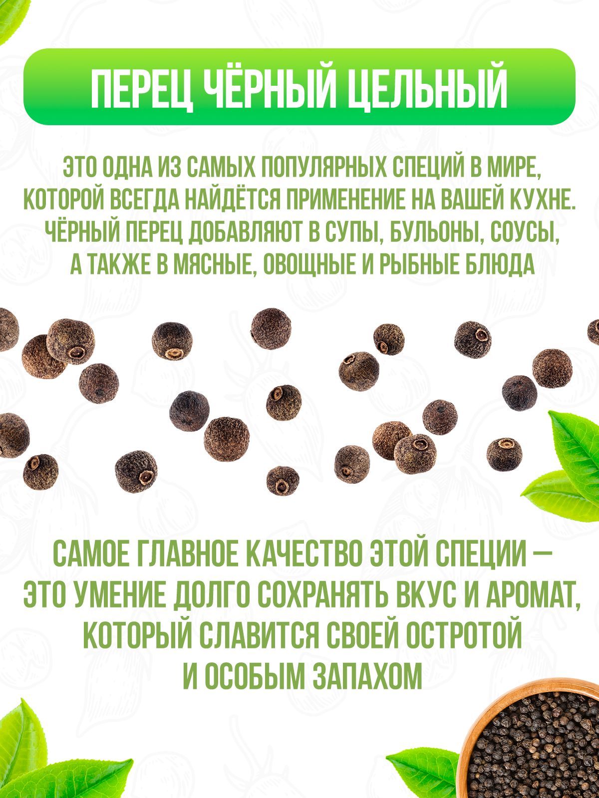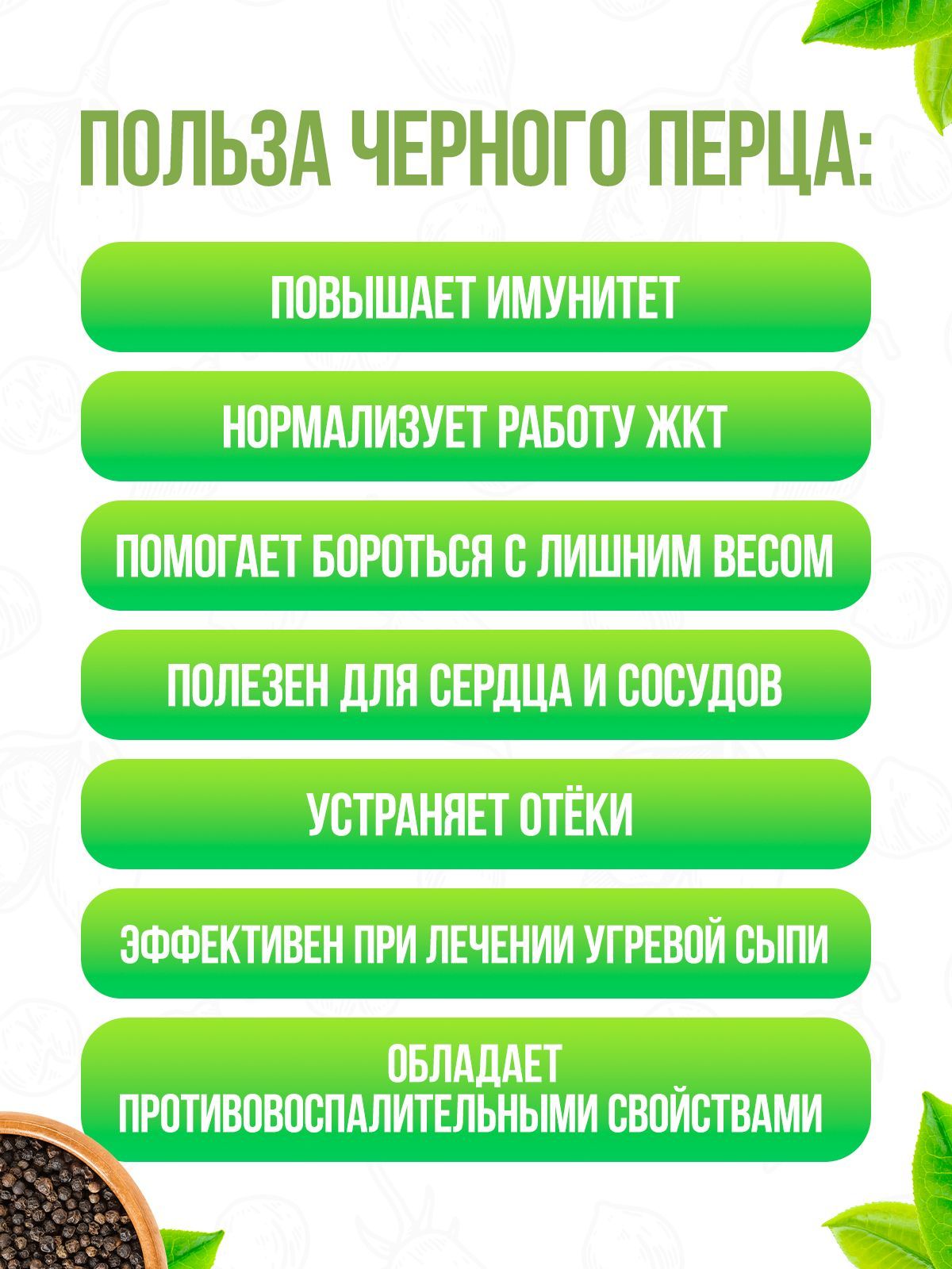 Описание: Черный перец выращенный в Шри Ланке - упакован так, чтобы сохранить питательные вещества, внешний вид и аромат продукта. Черный перец идеально дополняет любое блюдо, будь то суп, салат, мясо, рыба или даже выпечка! Не редко его используют в качестве добавки к сладкому десерту. Перец обладает приятным ароматом, жгучим вкусом и хорошо сочетается с другими специями, такими как: корица, имбирь, мускатный орех, гвоздика, кориандр и т.д. Черный перец обладает рядом других полезных свойств, нежели только придания остроты блюдам. В химическом составе чёрного перца горошком содержатся витамины: группы В, холин, А, С, Е, K, РР, бета-каротин (калоризатор). Минеральные вещества: фтор, калий, кальций, магний, цинк, селен, медь, марганец, железо, фосфор и натрий. Многие диетологи в разных странах указывают на следующие полезные свойства черного перца при регулярном и умеренном его употреблении как приправы к блюдам: способствует пищеварению, является антисептиком, разжижает кровь, улучшает кровообращение, очищает легкие и бронхи от мокроты.