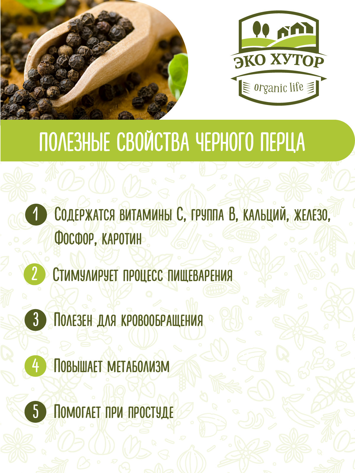 Описание: Перец черный - король пряностей. Он представляет собой высушенные плоды лианового индийского растения вида Piper nigru. Острота и пряные свойства чёрного перца зависят от содержания в его плодах особого вещества - алкалоида пиперина - и эфирных масел. Чёрным перцем приправляют мясные, рыбные, овощные, грибные, яичные блюда, салаты и супы.