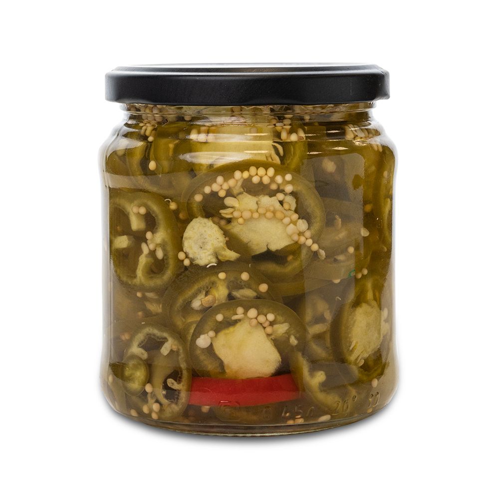 перец халапеньо резанный, вода питьевая, уксус спиртовой 9%, сахар, соль пищевая, чеснок свежий, семена горчицы, перец чили сухой, семена зиры, перец черный горошком.