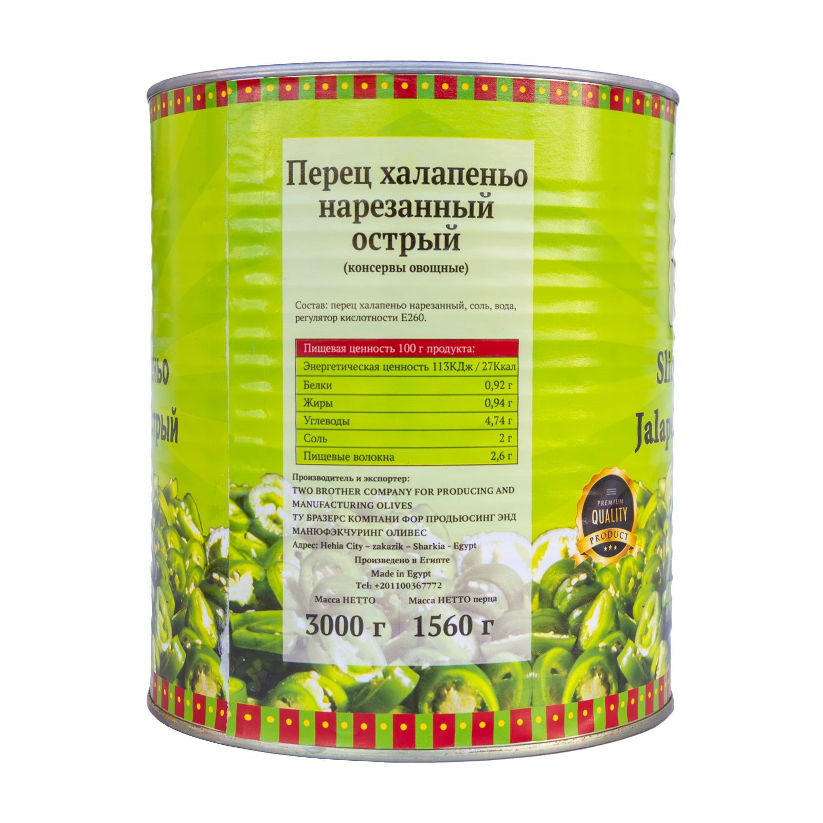 перец халапенью нарезанный, соль, вода, регулятор кислотности уксусная кислота. Энергетическая ценность: 113 ккал/100г, Белки 0,92г, Жиры 0,94г , Углеводы 4,74г