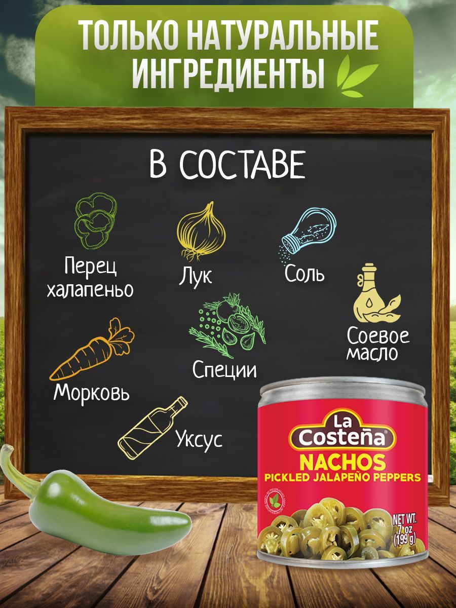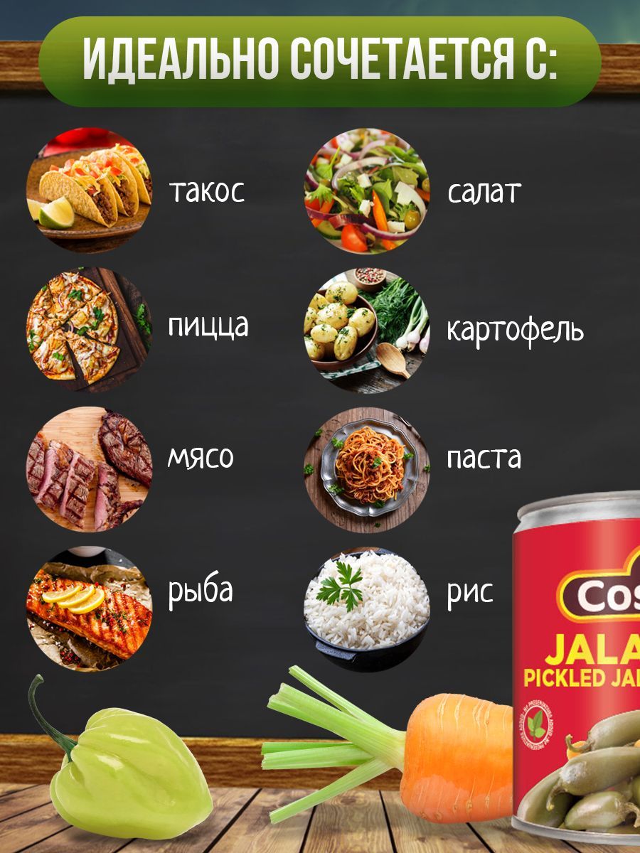Описание: Маринованный перец халапеньо, нарезанный кружочками – это оригинальная мексиканская закуска, которая может употребляться самостоятельно или добавляться в блюда для пикантности и аромата. Перец халапеньо является одним из самых популярных и востребованных ингредиентов мексиканской кухни, а также используется в кулинарии многих других стран. Зеленый халапеньо – идеальное дополнение к любому блюду: жареному мясу, рыбе, тушеным блюдам, стейкам, бургерам, буритто, такос, кесадилье. В составе только натуральные ингредиенты: перец халапеньо, вода, уксус, морковь, лук, йодированная соль, соевое масло и специи. Маринад на основе тростникового уксуса по рецепту La Costeña делает перец хрустящим с приятной кислинкой, сохраняет больше питательных веществ и увеличивает срок хранения. Он имеет низкую калорийность и подойдёт даже для тех, кто придерживается правильного или диетического питания, а также для веганского меню. Перец Халапеньо богат капсаицином, который помогает снизить уровень холестерина в крови и улучшить кровообращение. Кроме того, он содержит витамин С, витамин А и калий, что помогает укреплять иммунную систему, улучшать зрение и поддерживать здоровье сердца и сосудов.