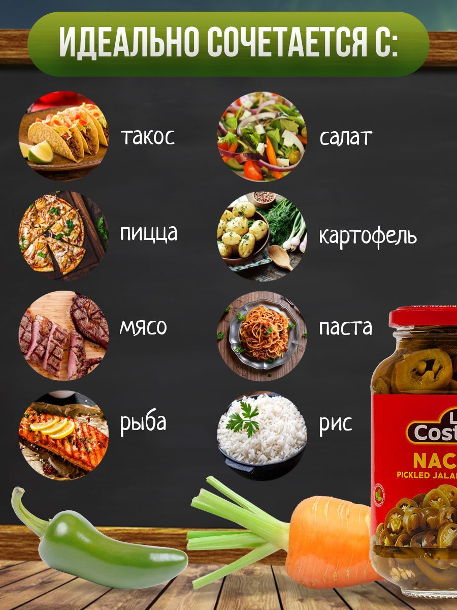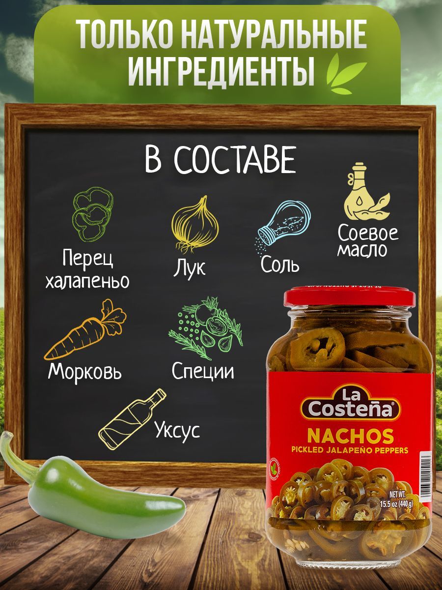 Описание: Маринованный перец халапеньо, нарезанный кружочками – это оригинальная мексиканская закуска, которая может употребляться самостоятельно или добавляться в блюда для пикантности и аромата. Перец халапеньо является одним из самых популярных и востребованных ингредиентов мексиканской кухни, а также используется в кулинарии многих других стран. Зеленый халапеньо – идеальное дополнение к любому блюду: жареному мясу, рыбе, тушеным блюдам, стейкам, бургерам, буритто, такос, кесадилье. В составе только натуральные ингредиенты: перец халапеньо, вода, уксус, морковь, лук, йодированная соль, соевое масло и специи. Маринад на основе тростникового уксуса по рецепту La Costeña делает перец хрустящим с приятной кислинкой, сохраняет больше питательных веществ и увеличивает срок хранения. Он имеет низкую калорийность и подойдёт даже для тех, кто придерживается правильного или диетического питания, а также для веганского меню. Перец Халапеньо богат капсаицином, который помогает снизить уровень холестерина в крови и улучшить кровообращение. Кроме того, он содержит витамин С, витамин А и калий, что помогает укреплять иммунную систему, улучшать зрение и поддерживать здоровье сердца и сосудов.