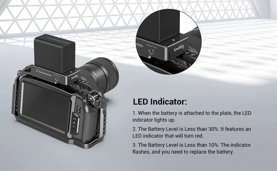 SmallRig NP-F пластина адаптера батареи Lite для BMPCC 4K & 6K 3093Предназначен для обеспечения большего срока службы батареи для BMPCC 4K, 6K или других устройств с помощью аккумулятора Sony NP-F. Он обеспечивает различные выходные порты, в том числе, работающего на постоянном токе 12 В (5,5/2,5 мм) выходной порт и 7,4 В постоянного тока (5,5/2,1 мм) выходной порт. Он имеет светодиодный индикатор загорится красным цветом в тех случаях, когда уровень заряда батареи составляет менее 30 процентов. Когда индикатор мигает, это означает, что уровень заряда батареи составляет менее 10 процентов, и вам нужно заменить аккумулятор. Пластина имеет резиновую прокладку на нижней части для более стабильной установки. Поставляется с LP-E6 кабелем для аккумулятора и кабелем DC-2 штифт LEMO.