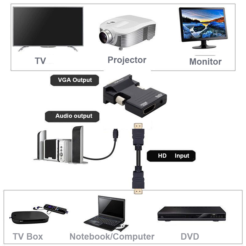 Просто Подключите гнездовой конец адаптера, совместимый с HDMI, к разъему, совместимому с HDMI, ноутбука или настольного ПК с помощью дополнительного кабеля, совместимого с HDMI, а гнездовой конец адаптера к кабелю VGA от дисплей. Он преобразует цифровой сигнал, совместимый с HDMI, в аналоговый сигнал VGA и поддерживает Полноразмерное разрешение высокой четкости 720p или 1080p. Идеальный компаньон для легкой и приятной жизни!