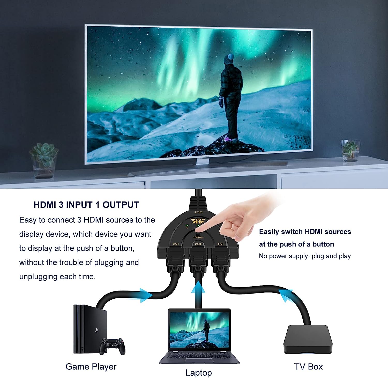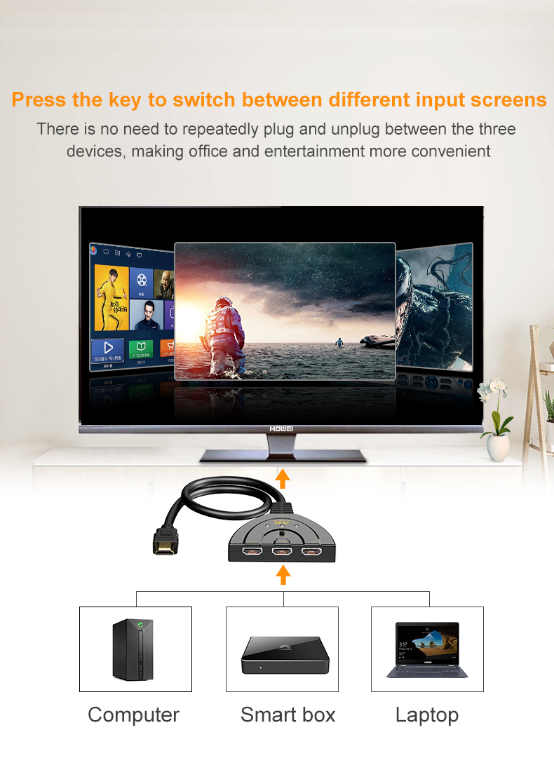 【Переключатель HDMI с выходом 3 в 1 】 Разветвитель HDMI 4K может легко передавать видео с 3 источников HDMI на 1 дисплей, совместим с приемниками Xbox 360, PS4,PS3,DVB, проигрывателем Blu-ray, ноутбук и большинство других аудио и видео устройств HDMI.✔Примечание: не может отображать 2 монитора одновременно.
