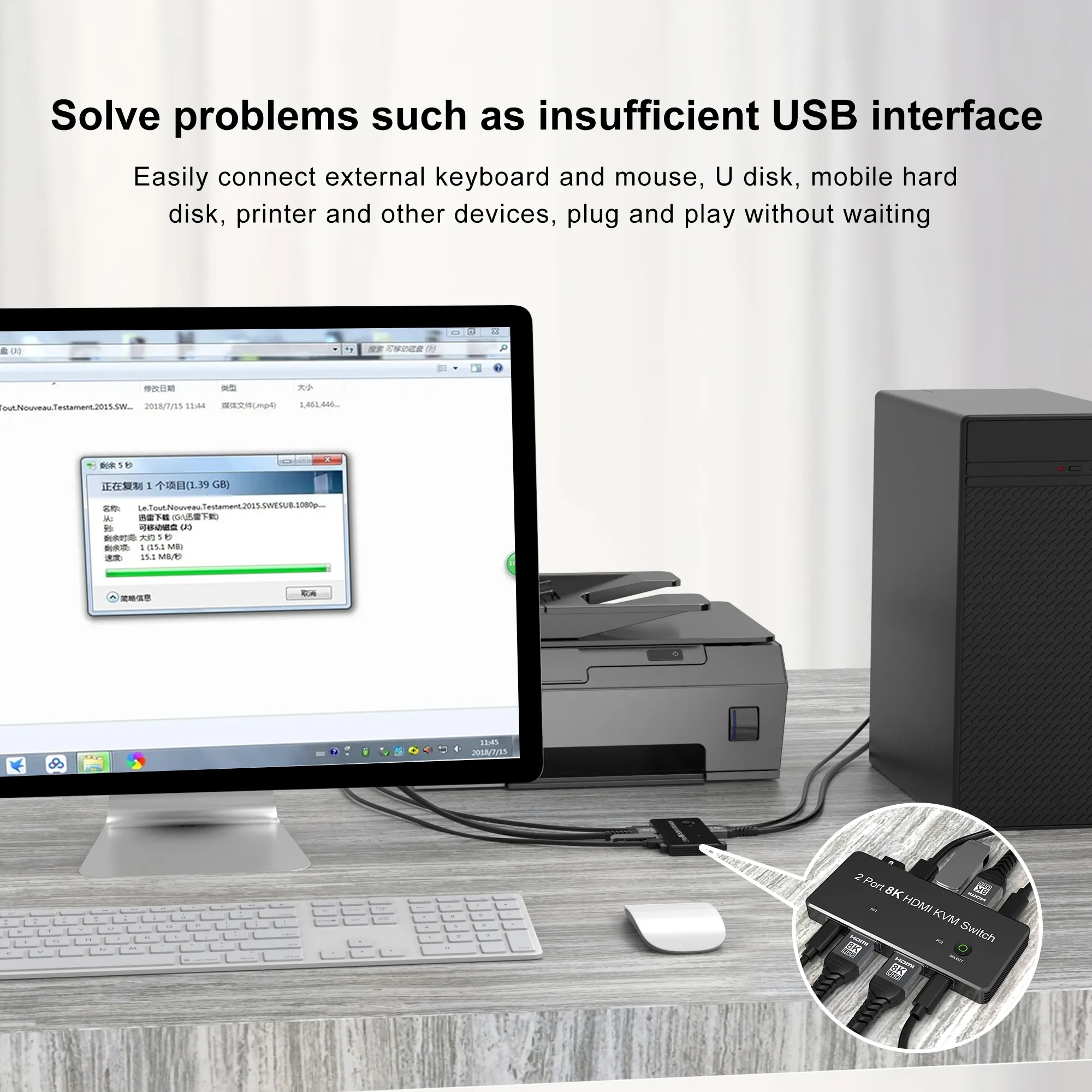 Этот переключатель KVM, вы можете легко управлять двумя своими компьютерами, подключив мышь, клавиатуру, U-диски к выходному USB-порту нашего коммутатора (переключение между двумя ПК)