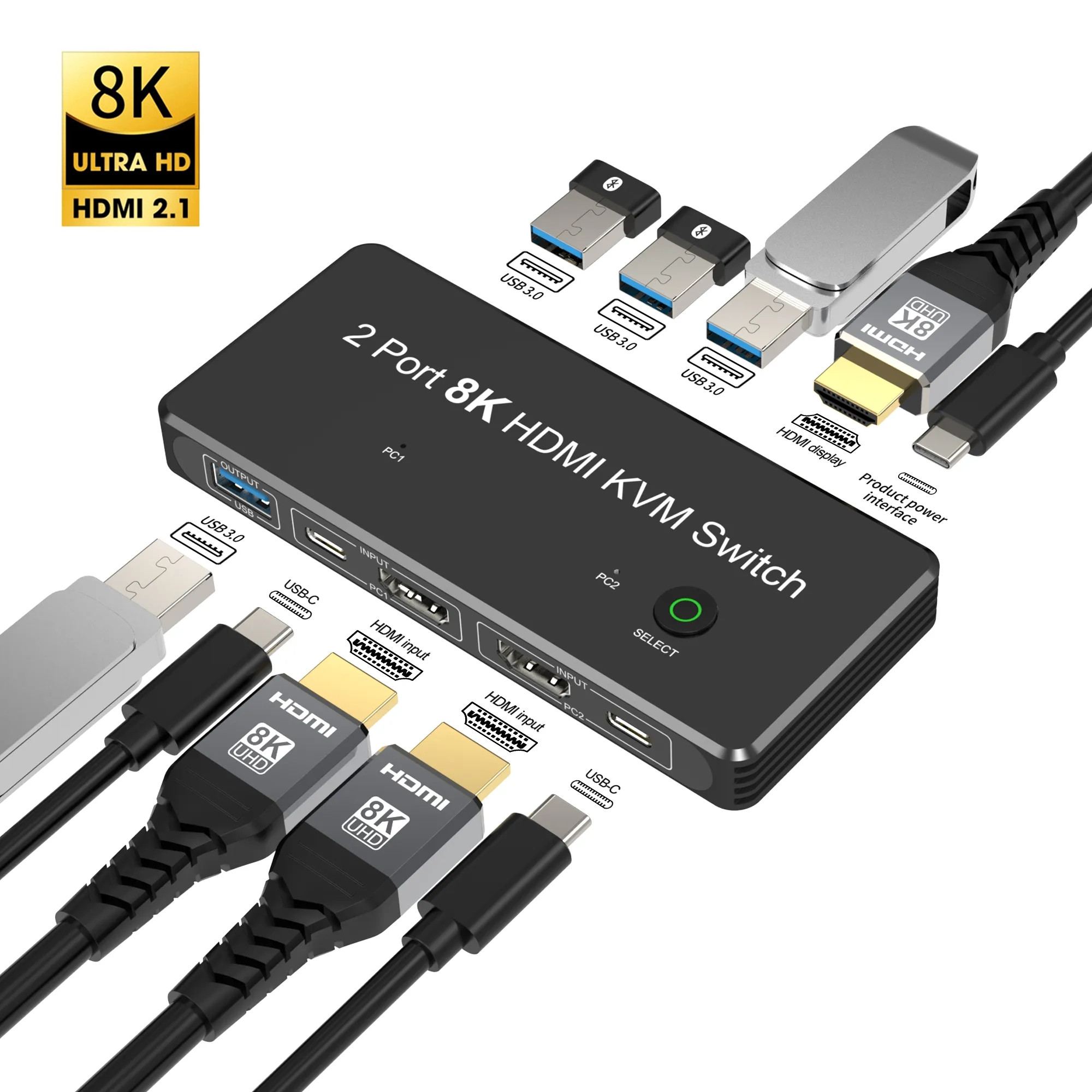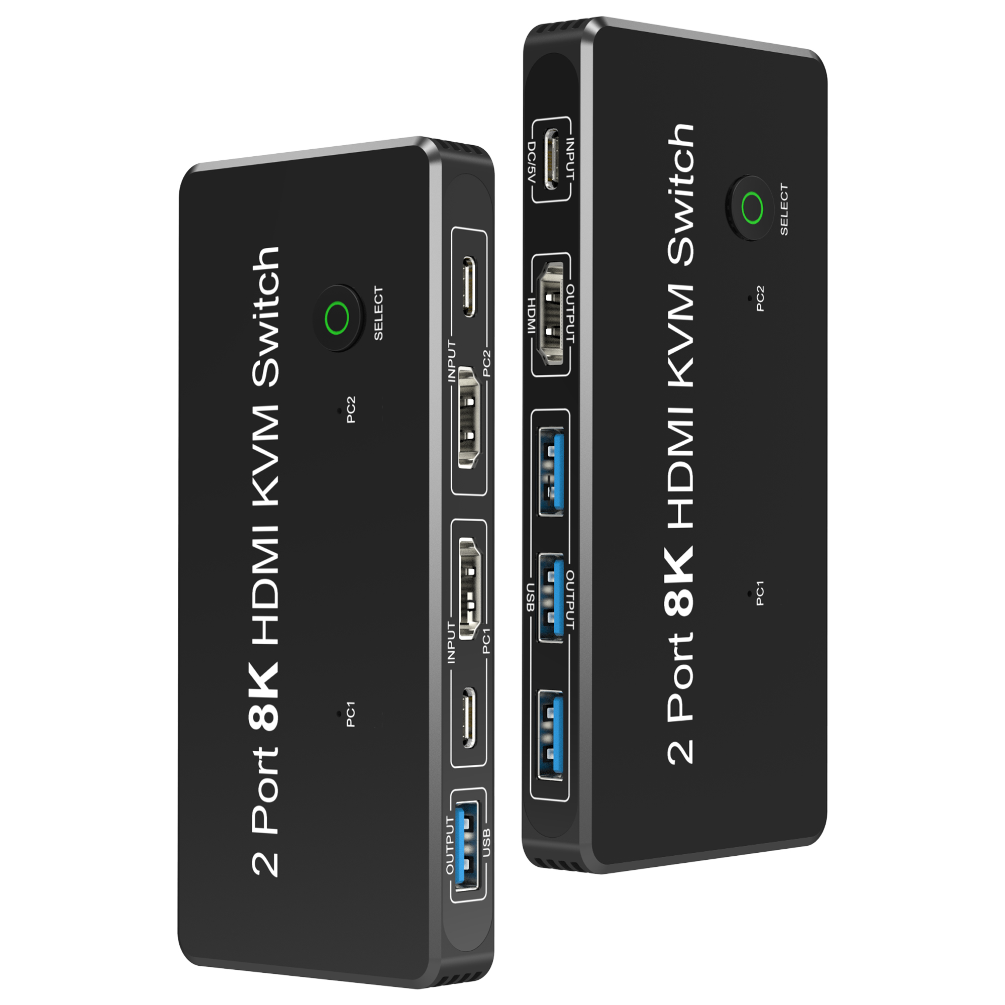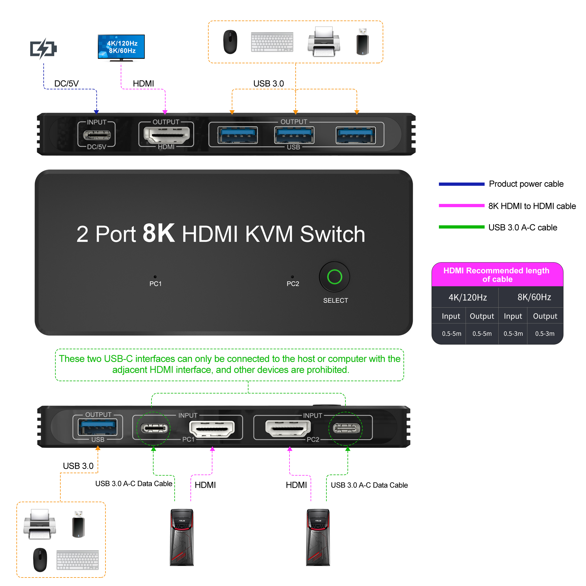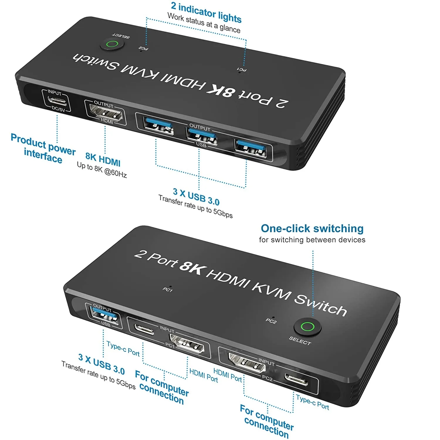 2 порта HDMI 2,1 8K KVM-переключатель, этот HDMI-коммутаторы позволяет подключаться от двух ПК (через HDMI к HDMI или мини-DP к HDMI, USB-C к HDMI,DP к HDMI кабели) на один монитор (через кабели HDMI на HDMI или HDMI на DP), вы можете нажать кнопку «ВЫБОР», чтобы переключаться между двумя ПК. *** Во время использования Подключите один USB-A к USB-C кабелю" Для питания коммутатора необходимо подключить порт постоянного тока/5 В к USB-устройствам.