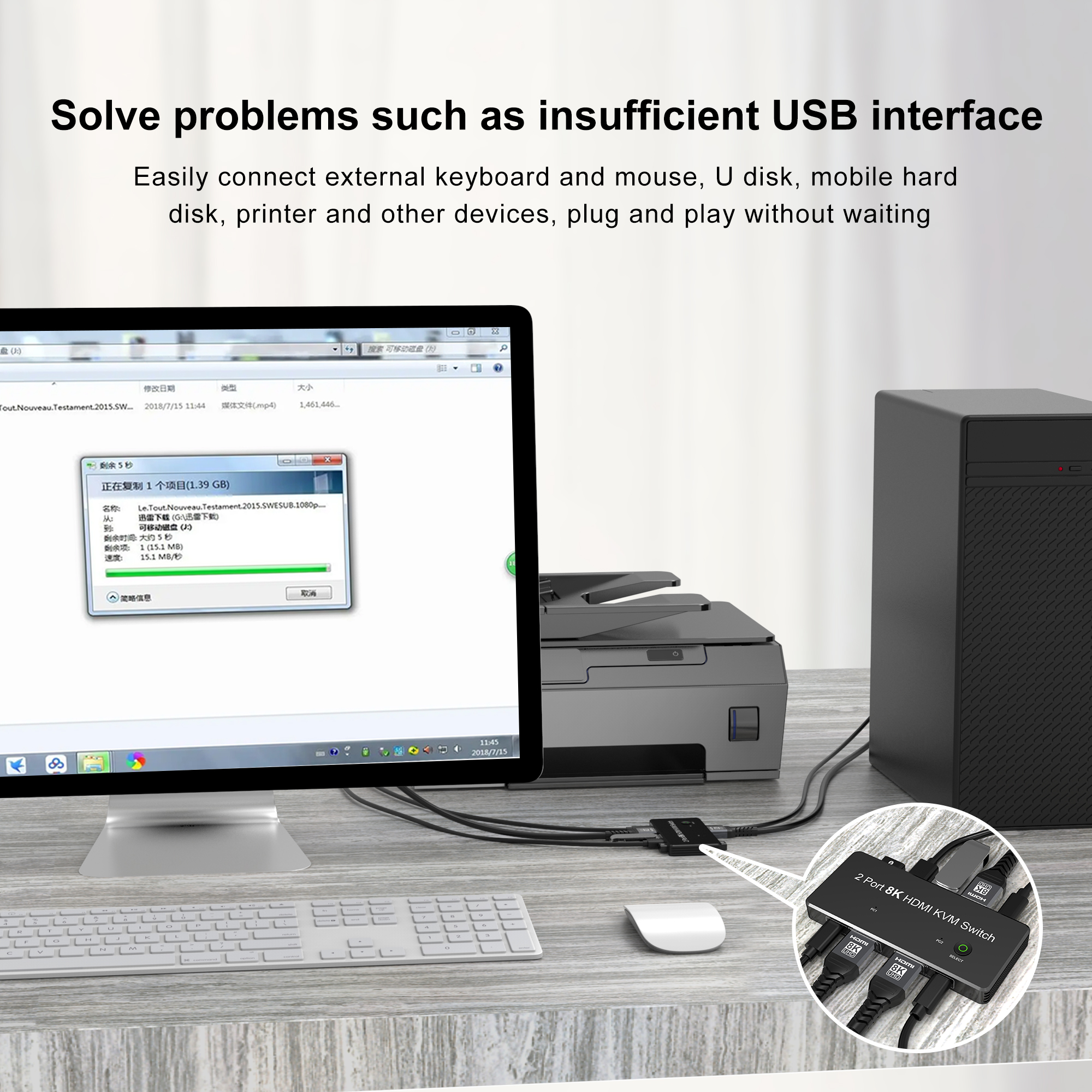 Широко используемый во многих случаях, этот переключатель HDMI 2,1 KVM можно использовать во многих случаях, решая проблему отсутствия USB-устройств **. Если у вас есть два ПК, но у вас только один комплект клавиатуры, мыши, u-дисков, с помощью нашего