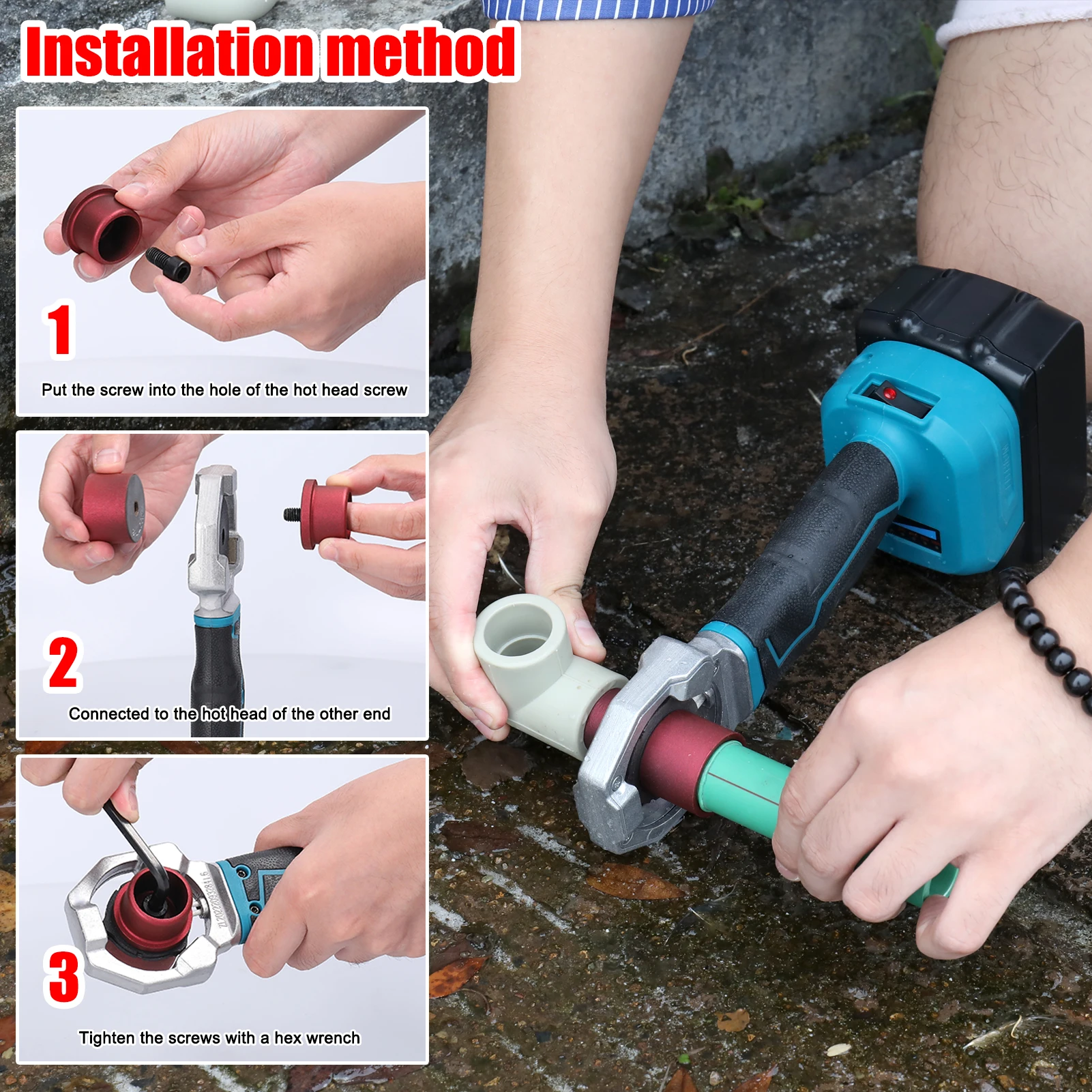 Это устройство для плавления водопроводных труб имеет высокую мощность, быстрый нагрев, высокую эффективность, равномерную и стабильную теплопроводность. Интеллектуальный чип контроля температуры, постоянная высокая температура 340 ℃, равномерный нагрев. Оснащен 3 различными характеристиками гладильных головок: 20 мм, 25 мм и 32 мм, их легко изменить в зависимости от использования. Питание от литиевой батареи (не входит в комплект), беспроводное и удобное, не будет ограничено источниками питания, удобно для использования в трубах горячей воды при отсутствии источников питания.