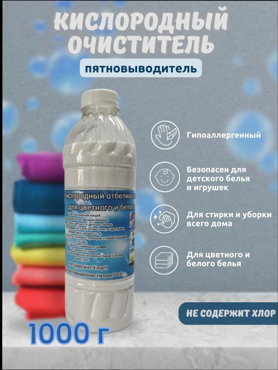 * ДезинфицируетТекст при отключенной в браузере загрузке изображенийИспользование:С помощью кислородного отбеливателя вы избавитесь от самых стойких пятен на тканях, а так же от любых загрязнений на различных поверхностях.