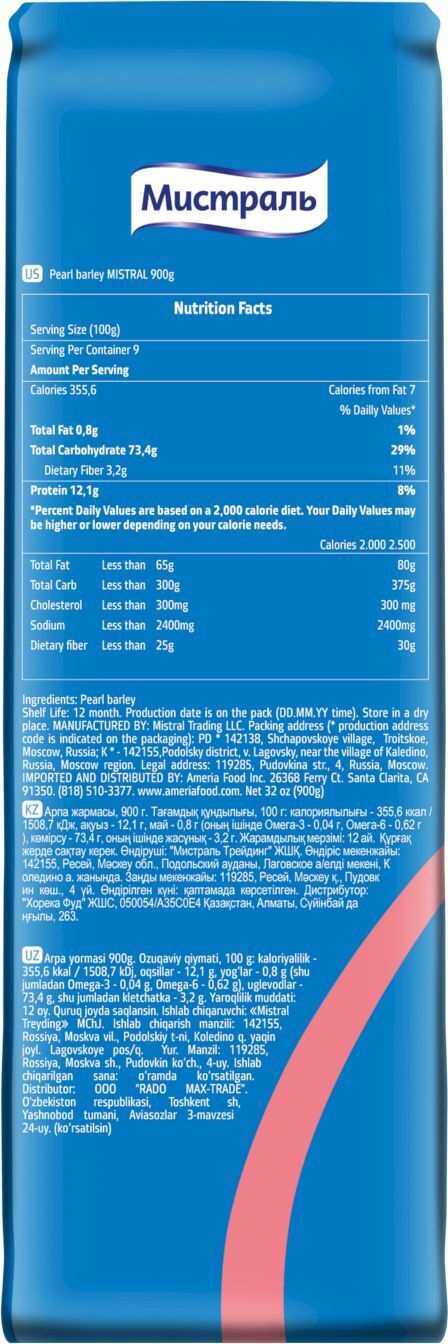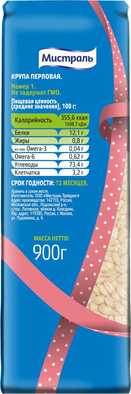 Описание: Рассыпчатая, нежная и ароматная перловая крупа содержит клетчатку и полиненасыщенные жирные кислоты Омега-3 и Омега-6. Подходит для каш, гарниров, а также дополнит любой суп. Экспертиза 30 лет работы на рынке и накопленный за эти годы опыт позволяют Мистраль выбирать лучшие сорта риса, сахара, хлопьев, бобовых и других круп со всего мира. Качество Многоступенчатая очистка сырья, контроль на всех этапах производства и хранения — залог высокого и стабильного качества Мистраль. Ассортимент Широкий ассортимент Мистраль удовлетворит вкусы самого требовательного клиента. Основа для творчества Мистраль — это основа для творчества, база для множества блюд мировой кухни.