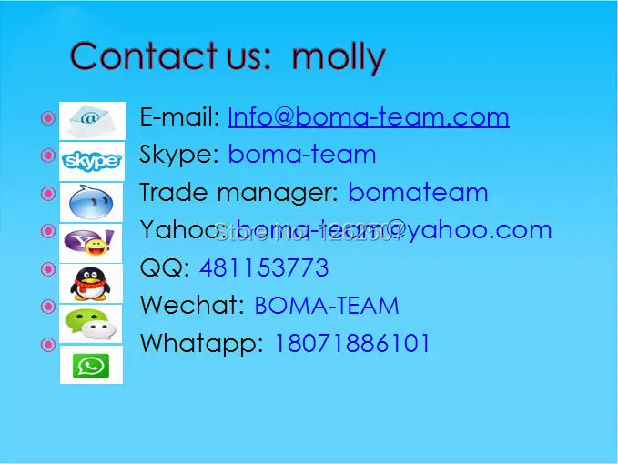 Связь: Пожалуйста, свяжитесь с нами через Alibaba (электронная почта, Trademanager или другая контактная информация нашего веб-сайта), если у вас есть какие-либо вопросы по нашим продуктам или услугам.