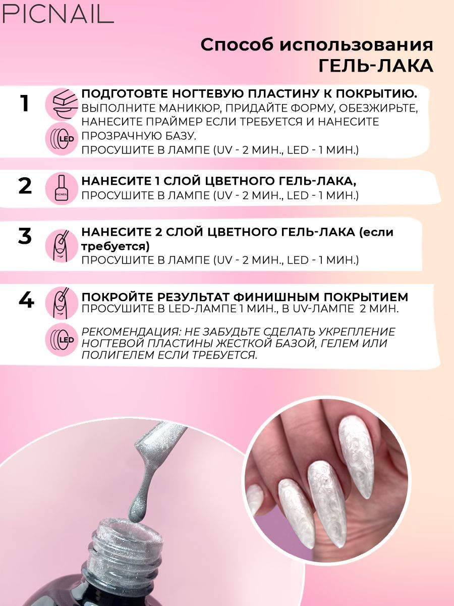 Описание: Гель-лаки открывают огромные возможности для самовыражения благодаря богатым палитрам и цветовым решениям. Лаки, отражающие искусственный свет, появились давно. Популярные люминесцентные составы, светящиеся в темноте, а также втирка, позволяющая добиться похожего эффекта неповторимого мерцания. Принципиальное отличие светоотражающих гель-лаков от них заключается в мельчайших частичках пластика или стекла, которые преломляют лучи и сияют ярче, чем глиттер. При дневном свете такой маникюр не привлекает много внимания и напоминает эффект голографического песка, но светодиоды или фотовспышка способны сотворить с ним настоящую магию! Светоотражающий гель лак для ногтей Super Disco от бренда PICNAIL имеет густую комфортную консистенцию, не растекается и самовыравнивается. Гель лак сияет и при обычном освещении, благодаря высокому содержанию светоотражающих частиц, под разным углом попадания света эффект меняется. Гель лак для маникюра подойдет для создания красивого дизайна ваших ногтей. Палитра гель лаков для ногтей позволяет сделать яркий и стойкий маникюр или, например, строгий и спокойный. Гель лак представлен в разных цветах: розовый, синий, серебристый, темно - розовый, медный, золотистый, коричневый, черный, красный. Гель лак Super Disco не нуждаются в цветной подложке и полностью перекрывают ногтевую платину с первого слоя.ехнология нанесения: 1. Подготовьте ногти, снимите глянец мягким бафом, обезжирьте, нанесите праймер, высушите на воздухе. 2. Нанесите базу, например (База для гель лака Dense Base) от бренда PICNAIL для гель-лака. Сушите в UV-лампе 2 минуты, в LED-лампе-1 минуту. 3. Нанесите выбранный гель-лак Super Disco. Сушите в UV-лампе 2 минуты, в LED-лампе-60 секунд. 4. Нанесите топ для гель лака, сушите в LED-лампе 60 секунд, в UV-лампе-2 минуты. Светоотражающий гель лак идеально подходит для креативных фотосессий и взрывных вечеринок. Перекрывать маникюр лучше всего глянцевым топом, который подчеркнет блеск, в отличие от матового топа. История маникюра насчитывает не одну тысячу лет, и за это время материалы и сама процедура претерпели ряд существенных изменений. Например, в Древнем Египте маникюр служил показателем социального статуса. Чем темнее был цвет ногтей, тем богаче считался их обладатель. Маникюр считали привилегией обеспеченных выходцев из высших сословий. Главным показателем была длина ногтей – китайские женщины носили золотые и серебряные наконечники, так как натуральные ногти часто ломались. Длинные ногти стали гораздо доступнее благодаря наращиванию, а украшение ногтей стразами и 3D-стикерами до сих пор пользуется большой популярностью. В современном мире для украшения ногтей так же используют бульонки, камифубуки, биндисы, жемчуг, кои, пайетки и др. А создать неповторимый дизайн можно в сочетании с любыми гель-лаками: кошачий глаз, с блестками, светоотражающими, неоновыми, с каучуковыми, глянцевыми и матовыми топами, с камуфлирующими, цветными и молочными базами. Бренд PICNAIL собрал самые необычные и трендовые оттенки баз, гель-лаков и топов для ногтей.