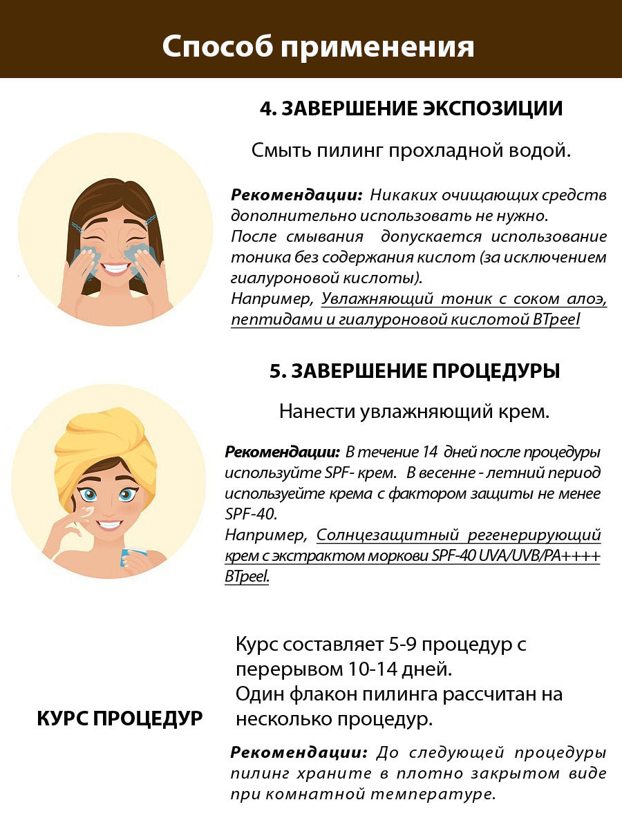 Перед нанесением средства провести демакияж и просушить кожу. Взболтать флакон с пилингом для достижения однородной консистенции. Кистью или ватной палочкой нанести первый слой средства на кожу, оставить на 3-4 минуты. После этого нанести второй слой и так далее. Допускается нанесение до 5 слоёв средства. Для прекращения действия кислот (прекращения экспозиции пилинга) на кожу наносится Нейтрализатор химических пилингов BTpeel. После нанесения нейтрализатора чувство жжения усиливается, но быстро проходит, и кожа должна в итоге успокоиться. Через 2-3 минуты нейтрализатор можно смыть водой. После процедуры пилинга Джесснера рекомендуется использовать маску Ламеллярная питательная маска "Три масла" с травяным экстрактом и пребиотиком BTpeel. Для пролонгации и усиления действия пилинга, начиная со следующего дня после процедуры, ежедневно (вечером) использовать Эмульсия-эксфолиант с гликолевой кислотой и пептидным комплексом BTpeel. Обязательно используйте солнцезащитные средства после процедуры и ежедневно в течение 10-14 дней после процедуры пилинга. Пилинг Джесснера, пили8нг, химический пилинг, кислотный пилинг, лучшие пилинги, купить пилинг, пилинг для лица, пилинг кожи, профессиональный пилинг, домашний пилинг, уход за лицом, уход за лицом пилинг, уход за лицом дома, процедура пилинга, чувствительная кожа, против акне, постакне, против чёрных точек, поры, сужение пор, очищение пор, сальные железы, очищение, очистка лица, тон кожи, рельеф кожи, дряблость, морщины, регенерация, упругость, омоложение, овал лица, фотосторение, пигментация, осветление пигментации, от пигментных пятен, против пигментации, гладкая кожа, сияющая кожа, идеальная кожа, чистка лица, эксфолиант, эксфолиация, скраб, отшелушивание, шелушение, здоровая кожа, здоровье кожи, профессиональная косметика, фруктовые кислоты, АНА-кислоты, молочная кислота, салициловая кислота, резорцин, витамин Е