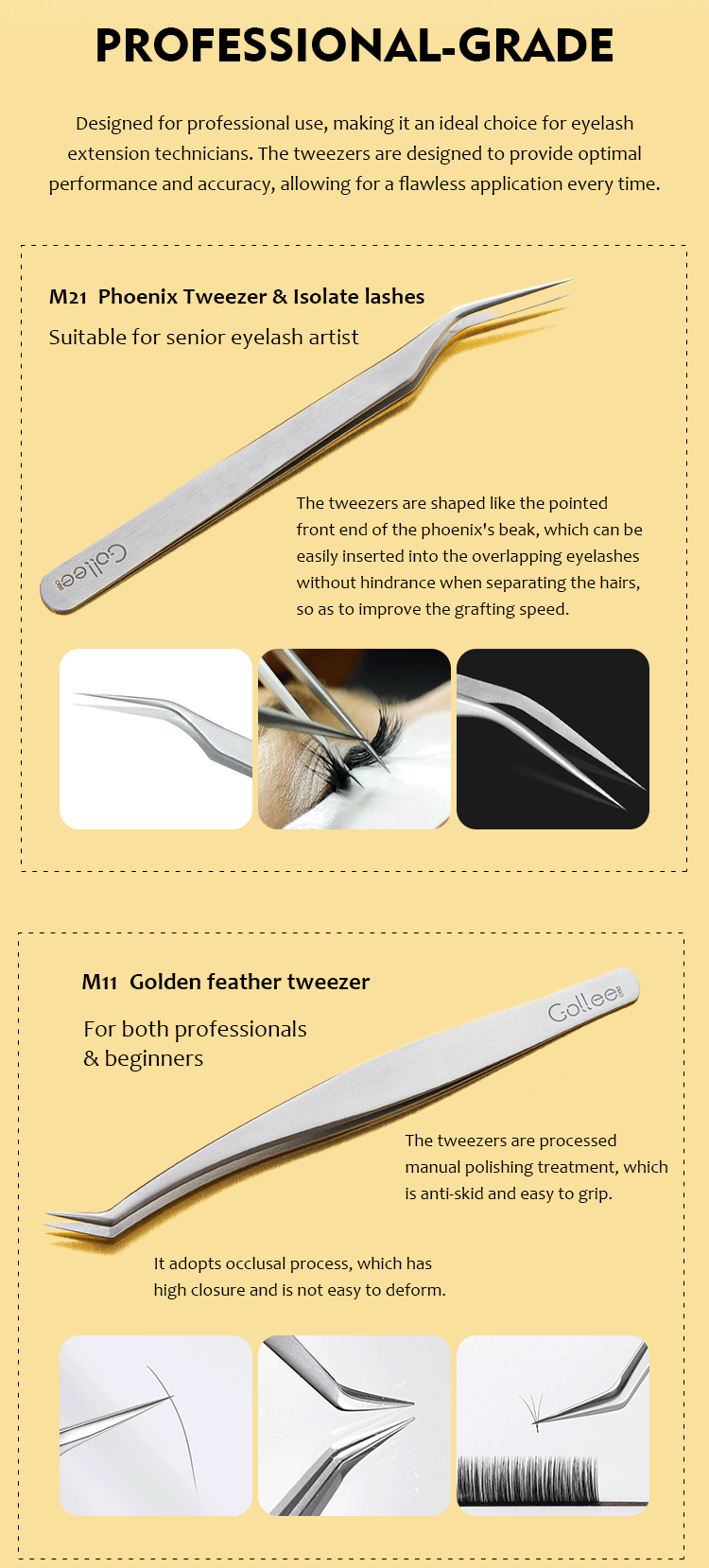Именно поэтому наш Gollee специализируется на производстве пинцетов серии M (M41, M21, M11, M31). Серия M-это специальные пинцеты с очень высокой точностью и высокой усталостной стойкостью, которые не нужно заменять в течение 1-2 лет, когда они хорошо защищены. Художники по наращиванию ресниц, которые продолжают использовать один пинцет, сформируют привычку без необходимости корректировать свои новые движения, и их эффективность увеличится.